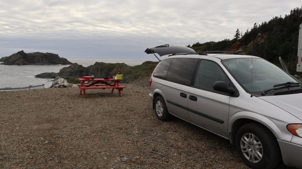 C’est en nous promenant dans ce coin, en fin d’après midi, que nous découvrons un joli terrain, surplombant la mer, aménagé pour recevoir 4 campings-car, avec des tables sur chaque emplacement. 3 véhicules sont déjà stationnés, le dernier est donc pour nous ! Il n’y a aucune indication, pas de panneau, cela semble pleinement gratuit et pas interdit. Parfait, la vue d’ici est superbe !