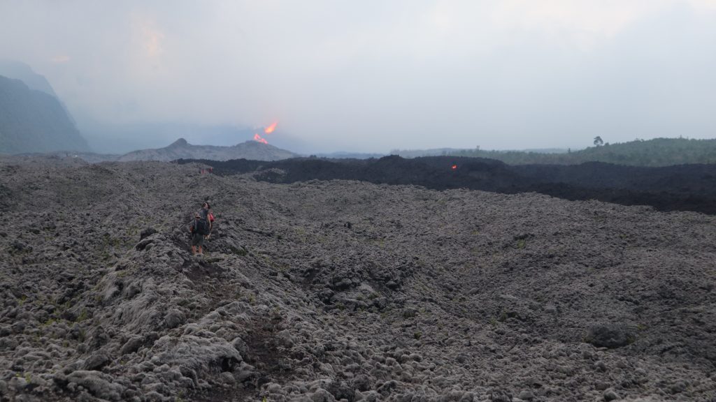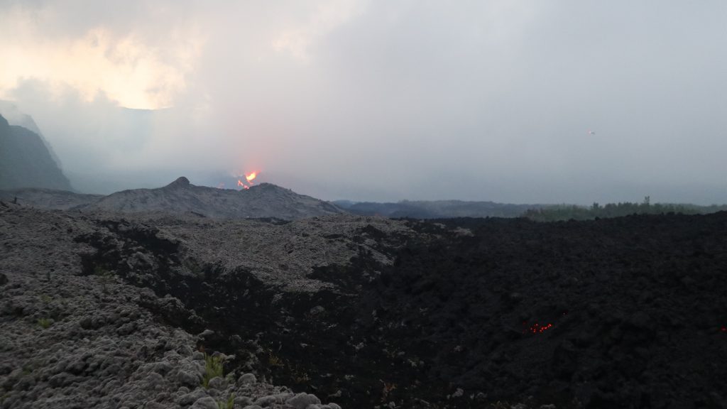 Lorsque nous sommes arrivés en bas des Grandes Pentes, là ou commence la randonnée vers le cratère Dolomieu, nous avons saisi l’ampleur de la situation. Des centaines de badauds se trouvaient là, sur le bas des pentes du volcan, à regarder la nouvelle coulée de lave descendre petit à petit. Le spectacle était déjà très impressionnant, nous n’avions jamais vu du magma de si près ! L’odeur et la chaleur sont exactement ce qu’on peut imaginer en se trouvant proche de la lave…