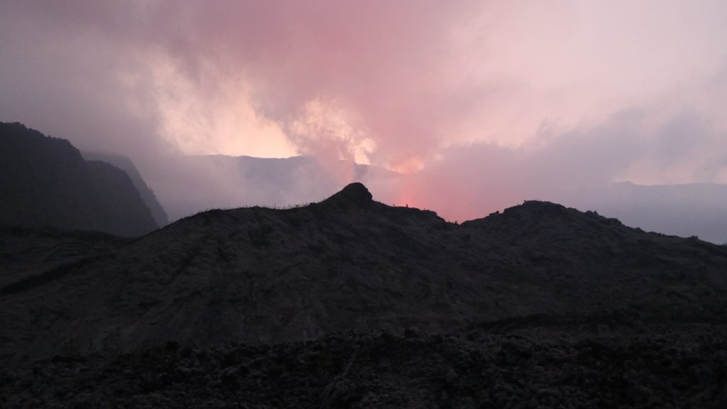 Revenant à la réalité après la contemplation (dans la chaleur !) de cette scène incroyable, nous avons enfilé nos lampes frontales et amorcé la descente du volcan. Le départ était plus pointu puisque nous étions sur la crête d’un ancien cratère, sans véritable chemin tracé. Dans la nuit et les petits cailloux, nous sommes donc descendus trèèès lentement. Nous n’avions bien sûr pas oublié de nous retourner de temps en temps pour admirer encore ce spectacle grandiose !