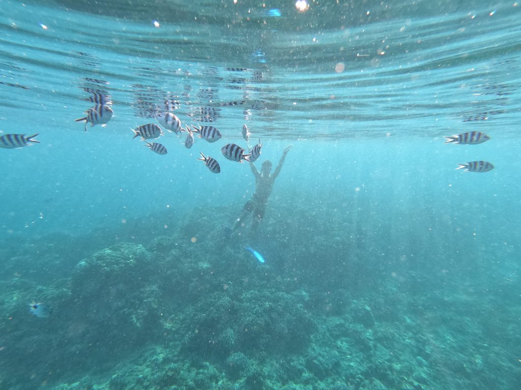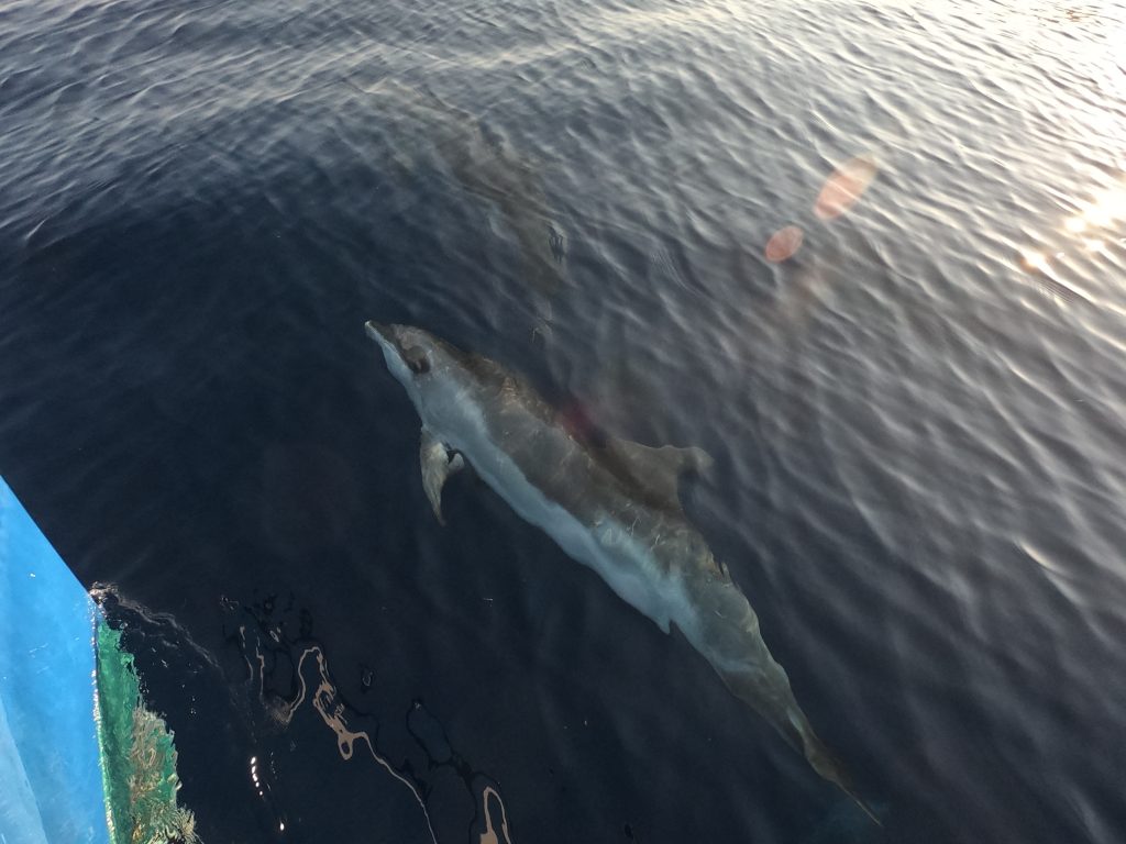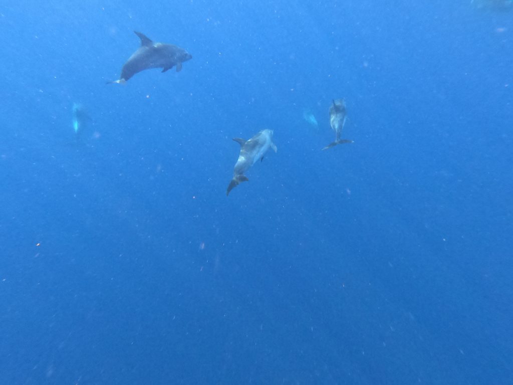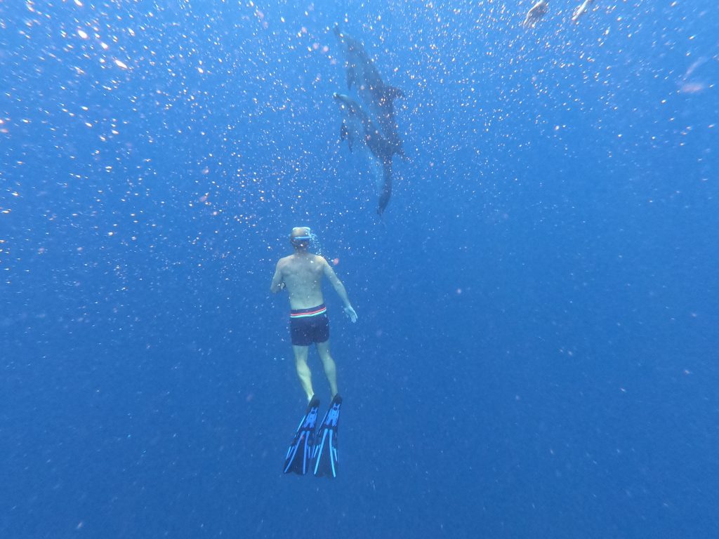 J’avoue ne pas être la plus à l’aise dans l’eau, et me jeter du bateau dans un endroit profond était déjà assez paniquant pour moi, surtout avec un masque sur la tête et un tuba dans la bouche. Une fois dans l’eau, Cédric m’a crié de vite plonger car des dauphins étaient autour de moi. J’ai aussitôt mis la tête sous l’eau et me suis retrouvée nez à nez avec un dauphin qui me fonçait dessus. WAH ! C’est un effet peu habituel…