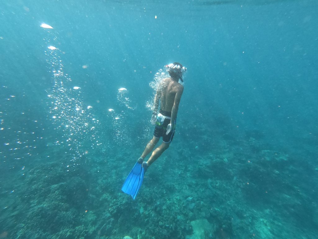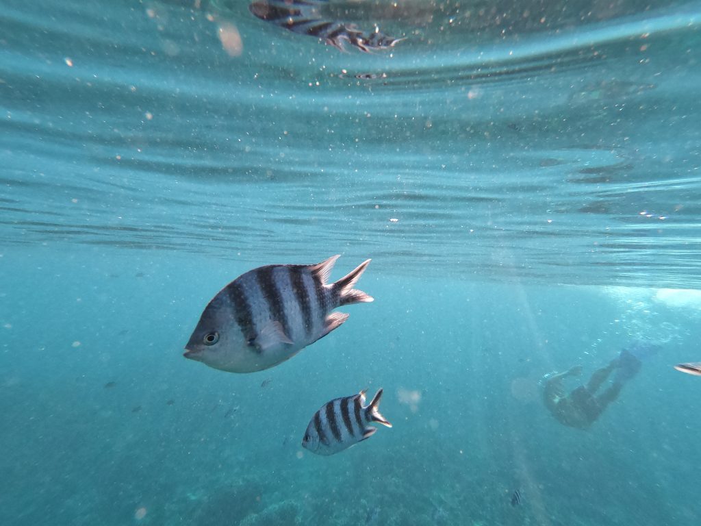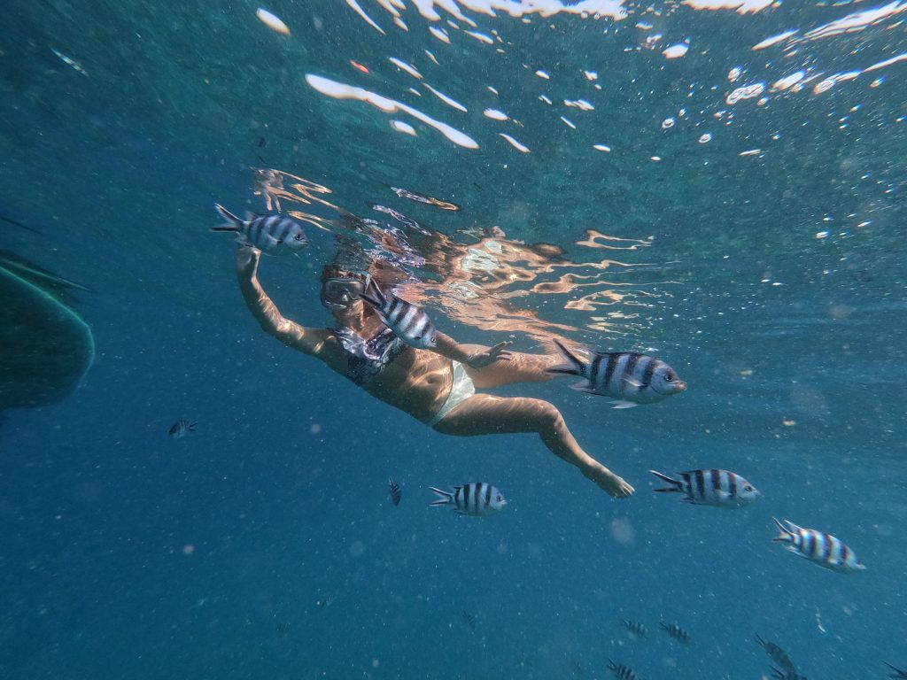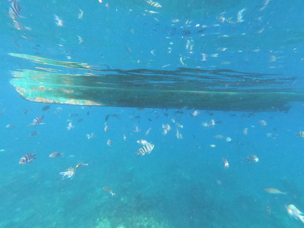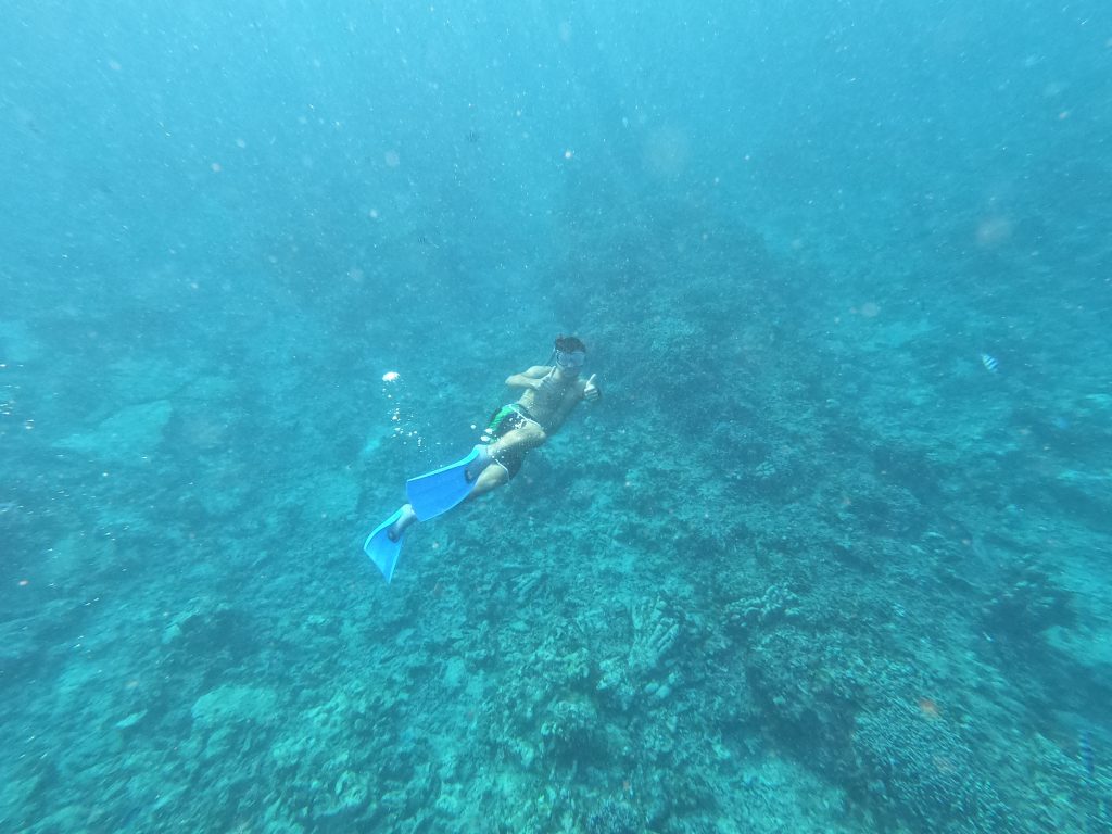 J’avoue ne pas être la plus à l’aise dans l’eau, et me jeter du bateau dans un endroit profond était déjà assez paniquant pour moi, surtout avec un masque sur la tête et un tuba dans la bouche. Une fois dans l’eau, Cédric m’a crié de vite plonger car des dauphins étaient autour de moi. J’ai aussitôt mis la tête sous l’eau et me suis retrouvée nez à nez avec un dauphin qui me fonçait dessus. WAH ! C’est un effet peu habituel…
