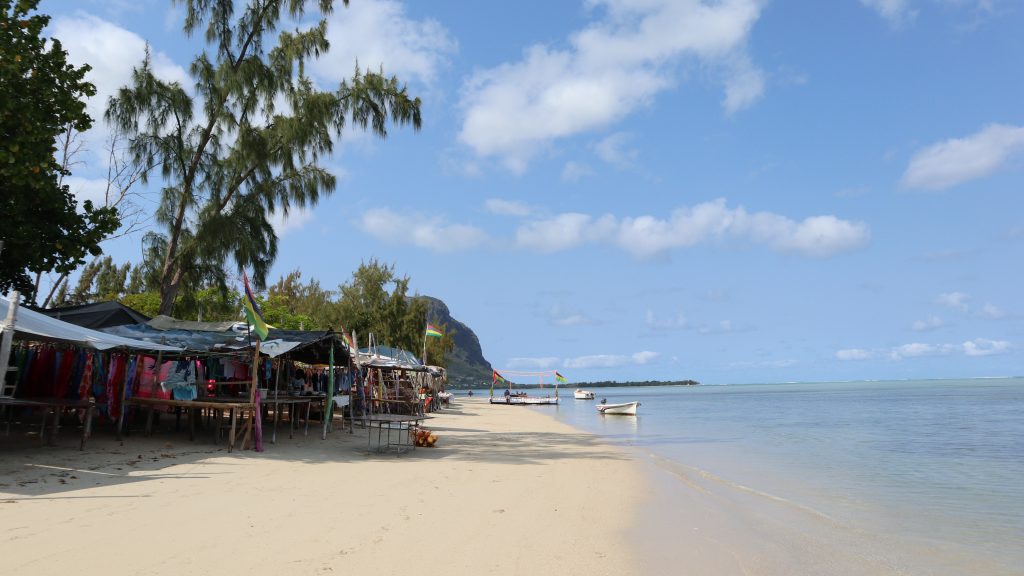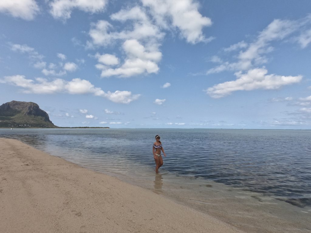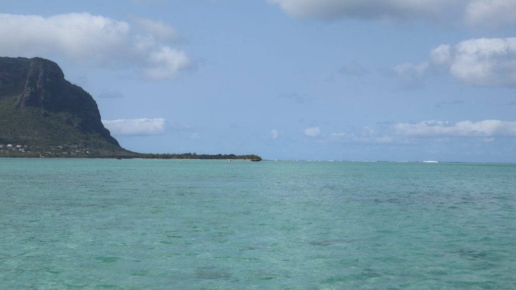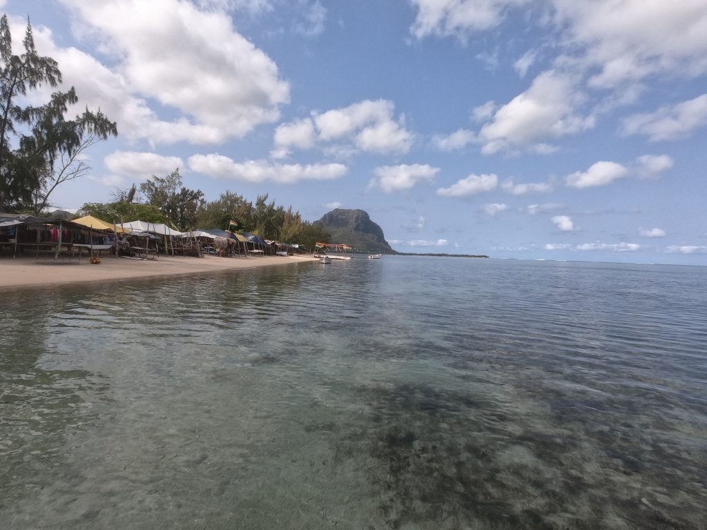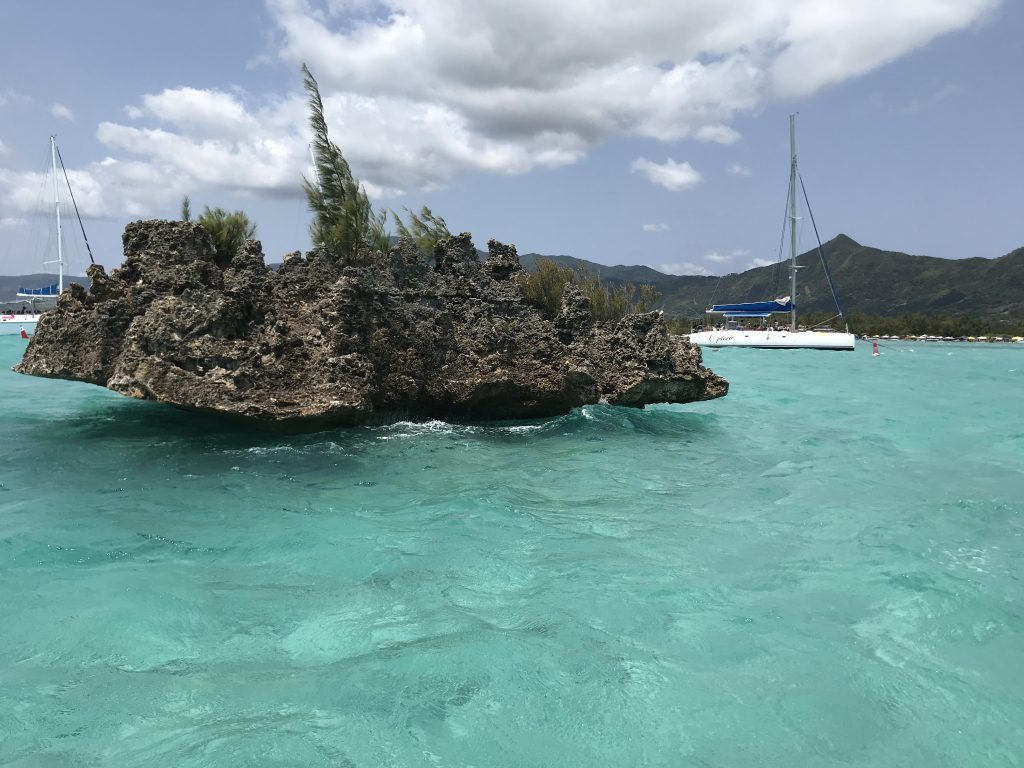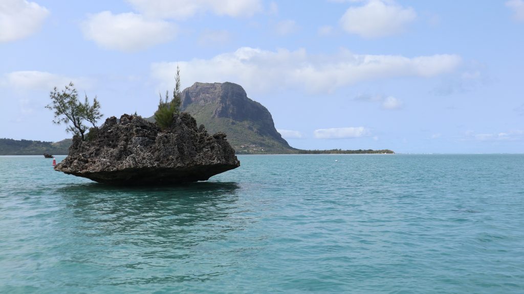 Cette formation rocheuse naturelle, posée comme un diamant sur l’eau, avec en toile de fond le Morne pour un paysage ultra photogénique, est en fait un énorme corail ayant poussé hors de l’eau. Autour de lui, on trouve uniquement du sable fin. Nous l’avons vu différemment lors de notre premier passage, vers 9h le matin, alors que l’eau était très basse, et lors de notre second passage, vers 13h, alors que l’eau avait monté. Dans les deux cas, le paysage est juste incroyable !