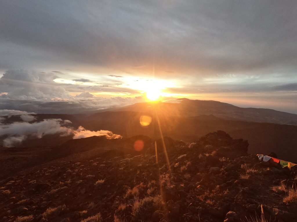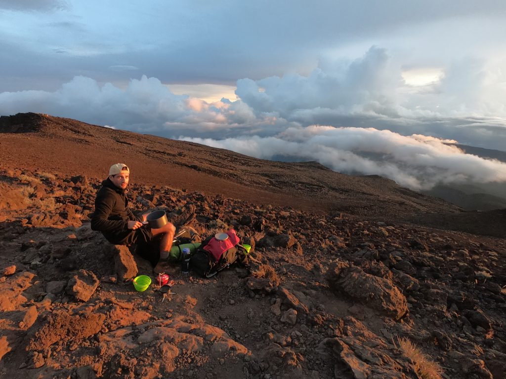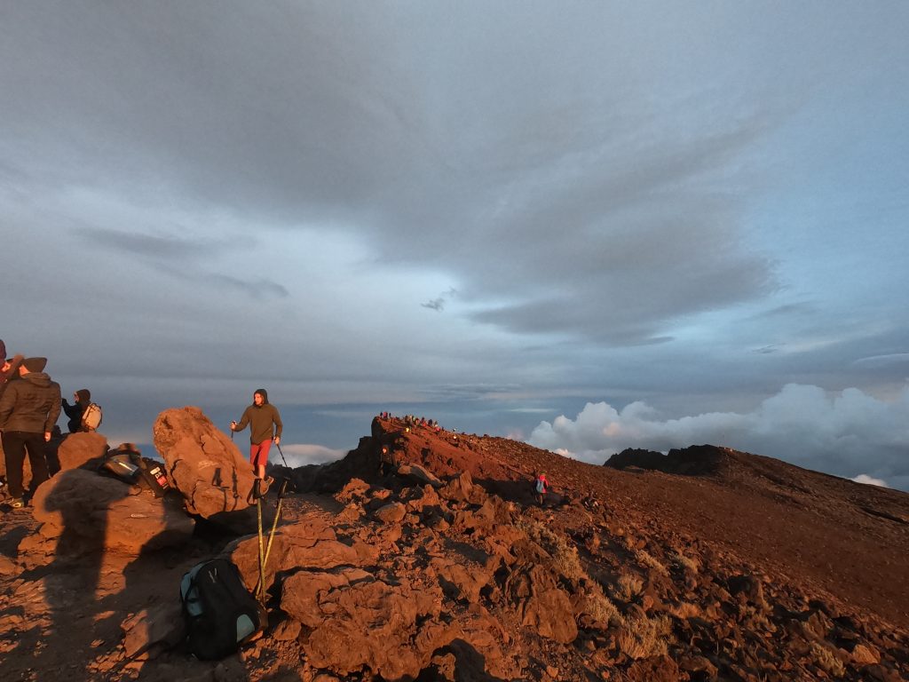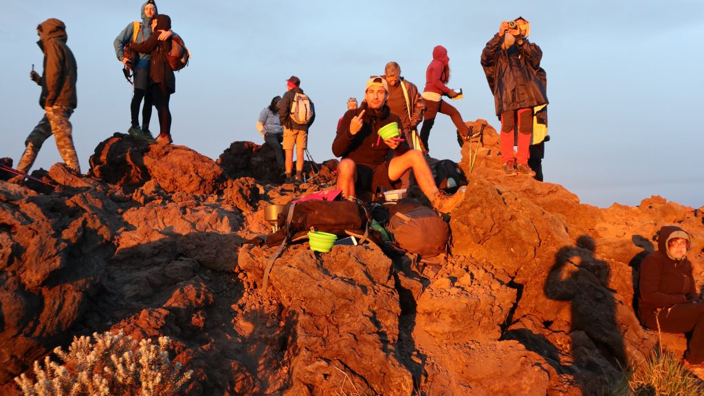 Pour ne pas avoir froid, nous avions chacun enfilé plusieurs couches de vêtements : un collant et un jogging par dessus en bas, un T-shirt à manches, un haut technique à manches, et encore une polaire par dessus en haut. Nous n’avons pas eu froid mais la nuit fut tout de même très courte. Les bourrasques de vent était très importantes et faisaient beaucoup de bruit. Alors que j’ai pu dormir environ 1h30, Thibault n’a dormi que quelques minutes par-ci par-là. Vers 4h30 du matin, nous avons été réveillés par les premiers marcheurs venant du gîte. Nous nous sommes levés rapidement pour replier la tente, ranger les affaires, et pouvoir aller prendre notre petit-déjeuner face au soleil levant. Et il était vraiment temps ! Même si le lever du soleil n’était indiqué à la météo qu’à 5h38, le ciel était déjà coloré de rose, de jaune et de orange sur les coups de 5h du matin. Il ne faut donc pas arriver plus tard au sommet.