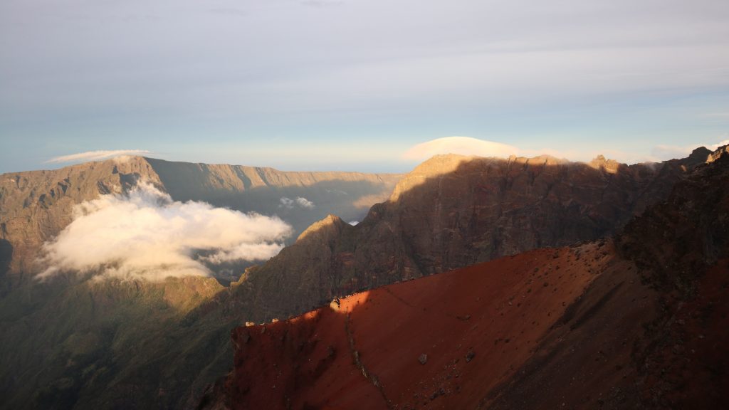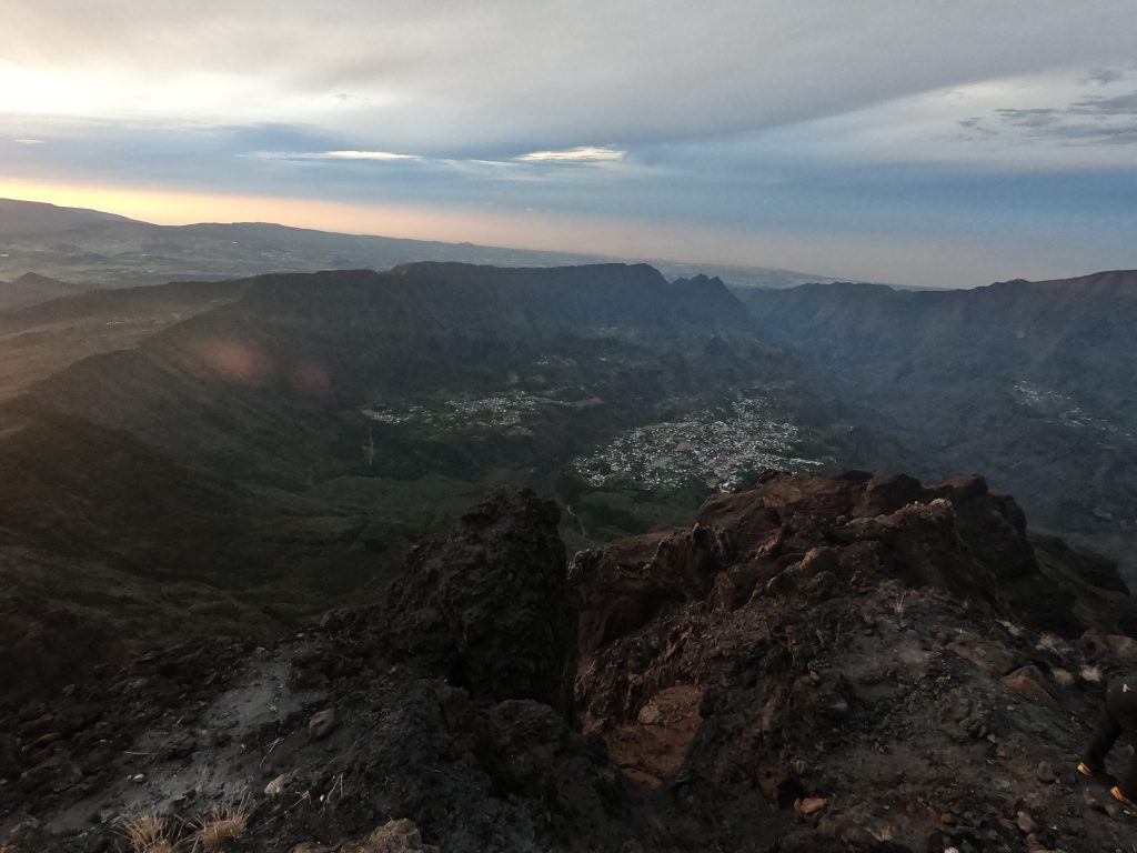 Je précise en ironisant un coin « tranquille » car, on ne va pas se mentir, c’est une industrie ! Alors que nous étions moins d’une dizaine à dormir au sommet, au lever du soleil, à 5h du matin, il y avait une bonne soixantaine de personnes. Autant vous dire qu’il faut vous préparer à entendre fuser les « C’est le Grand-Bénare en face » « C’est Mafate à gauche » « Oh on voit Cilaos en bas »… Bref, les commentaires des autres, venant toujours briser la tranquillité de l’instant. Et le moins qu’on puisse dire, c’est que Thibault les adore, les autres…