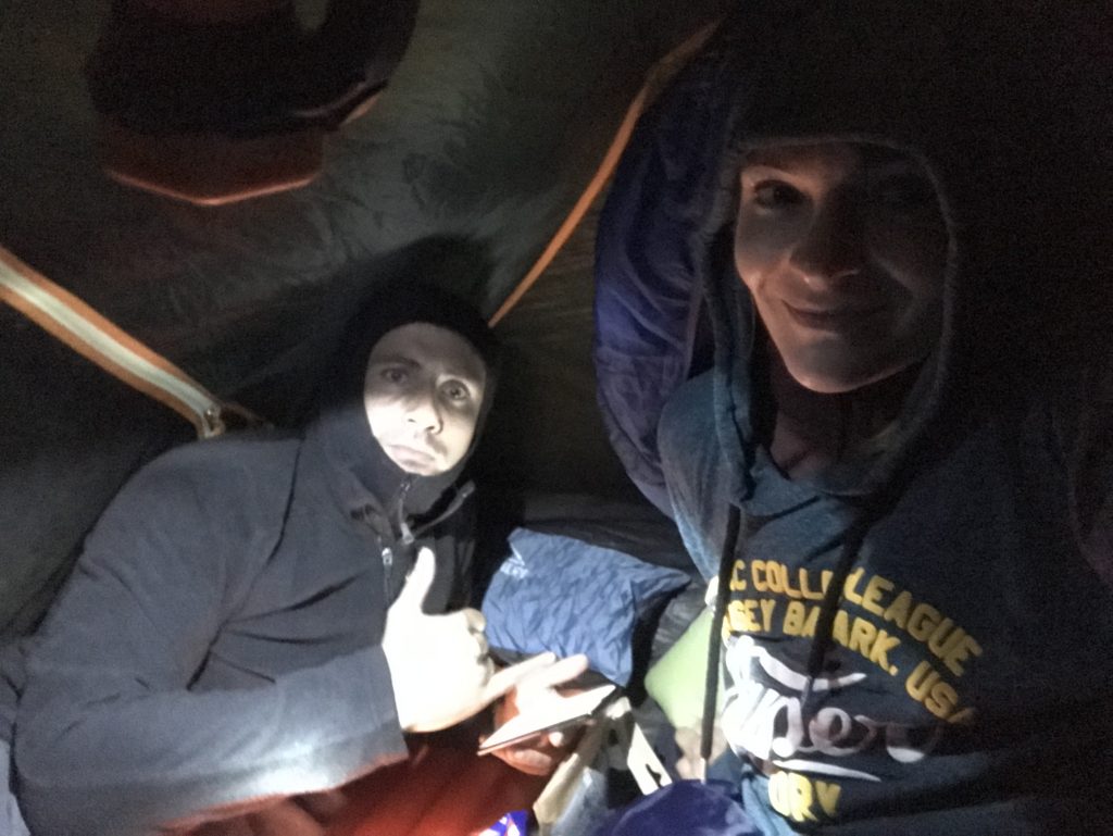 C’est silencieusement pour ne pas réveiller les quelques autres courageux dormant au sommet, et efficacement, que nous avons installé notre campement. A minuit, nous étions au chaud, dans nos duvets, en train de déguster nos sachets de pâtes lyophilisées. Attention je vous préviens, la photo est collector !