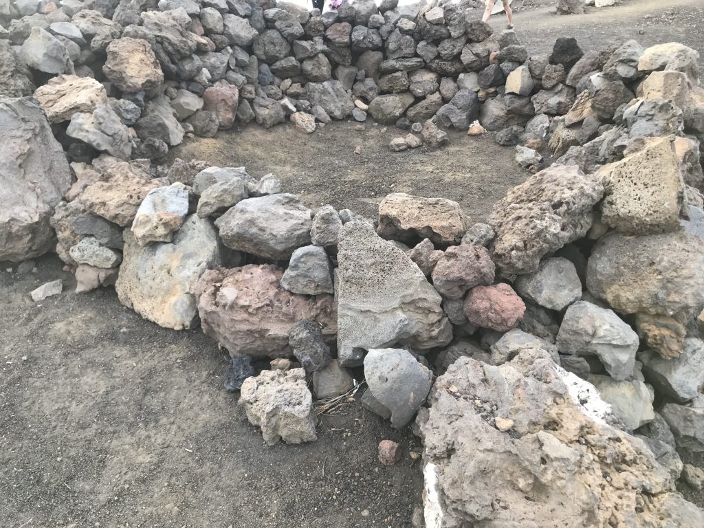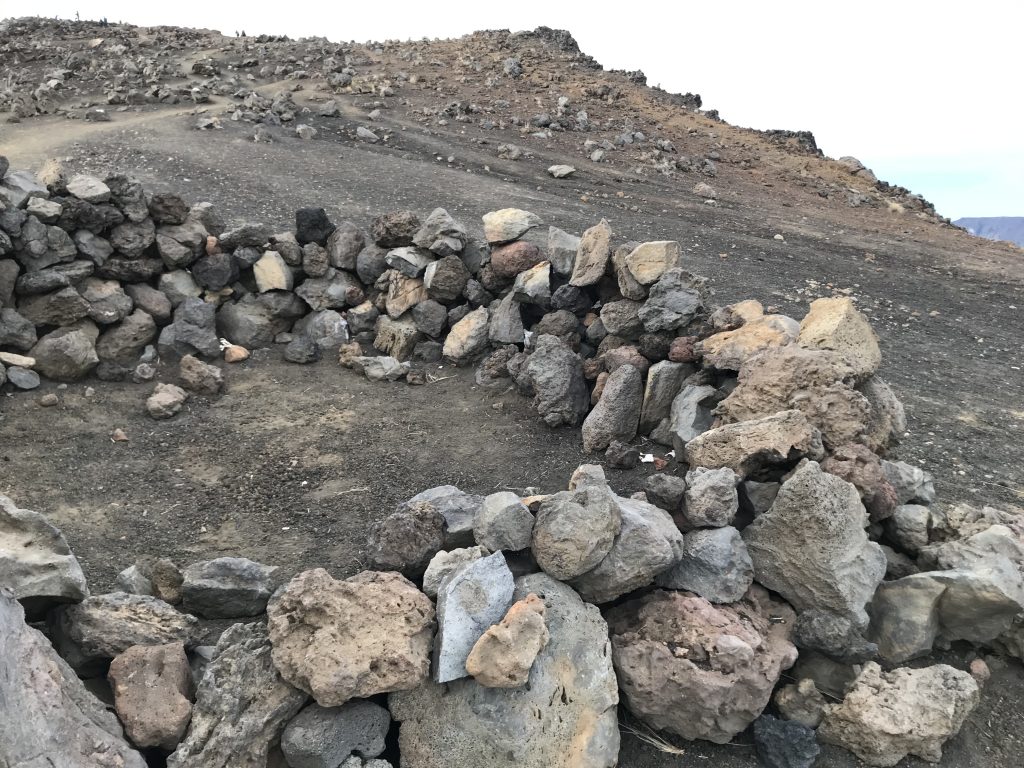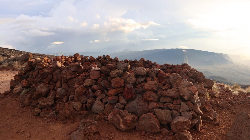 D’emblée, un groupe de campeurs déjà installé et encore debout nous a désigné un emplacement encore disponible, juste à côté du leur. Au sommet du Piton des Neiges, un petit dizaine d’emplacements pour les tentes sont prévus, entourés de cairns (des espèces de murs en pierres), pour protéger du vent. Une chance d’en avoir eu un encore disponible en arrivant aussi tard !