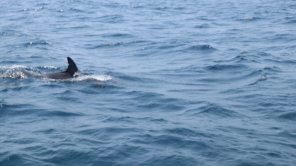 Et la différence s’est déjà sentie ! Alors qu’ils étaient la première fois beaucoup plus en surface, avec nous, ils nageaient cette fois-ci beaucoup plus au fond de l’océan. Nous pouvions donc les voir du dessus, nageant au-dessus d’eux. Un de nos camarades de bateau, bon nageur, a pu plonger assez profondément pour aller au plus près d’eux. J’ai pour ma part préféré rester en surface et les observer d’en haut.