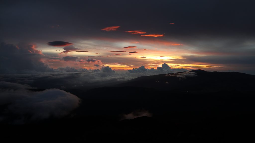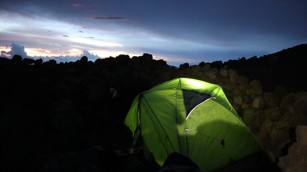 Pas une seule âme qui vive à l’horizon, ni un seul bruit à l’intérieur du gîte alors qu’il n’était que 21h30… les marcheurs avaient dû se coucher tôt en prévision du lever très matinal pour aller admirer le lever du soleil au sommet. Nous avons cherché, silencieusement, à remplir nos gourdes d’eau… Pas de chance, pas d’eau potable dans le gîte ! Nous avons tout de même bu une gourde que nous avions apportée et l’avons remplie d’eau non potable, que nous ferions bouillir par la suite pour préparer notre repas.