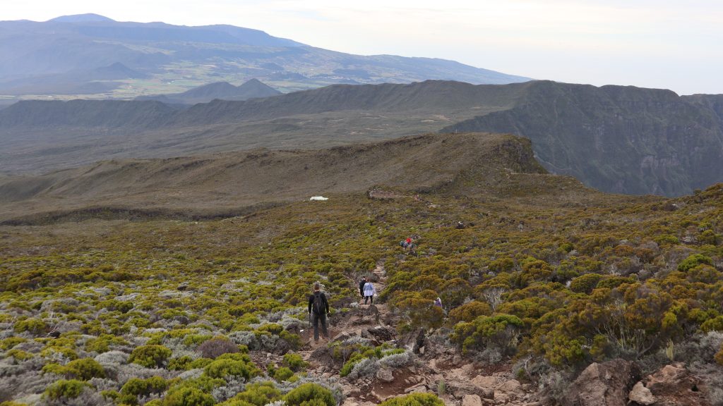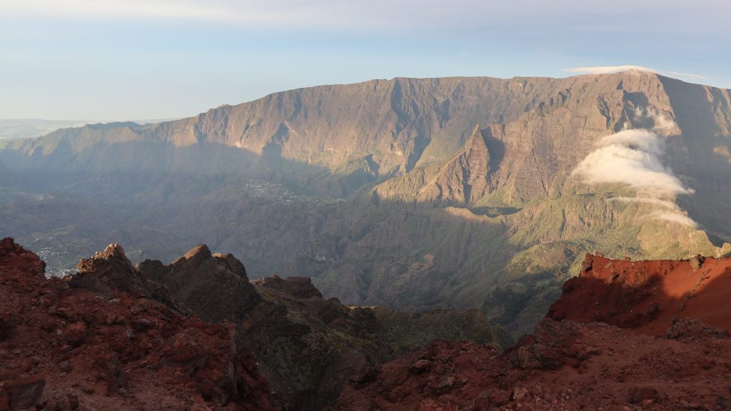 Cependant, effectivement, la vue sur le Grand Bénare en face, et Cilaos à nos pieds, est époustouflante. On prend ici toute la mesure de ce relief unique qui constitue l’île de La Réunion, avec ses piques acérés, ses crêtes, ses pentes raides, tantôt verdoyantes, tantôt rouge volcanique, ce vide, cette immensité. Le paysage est magnifique.