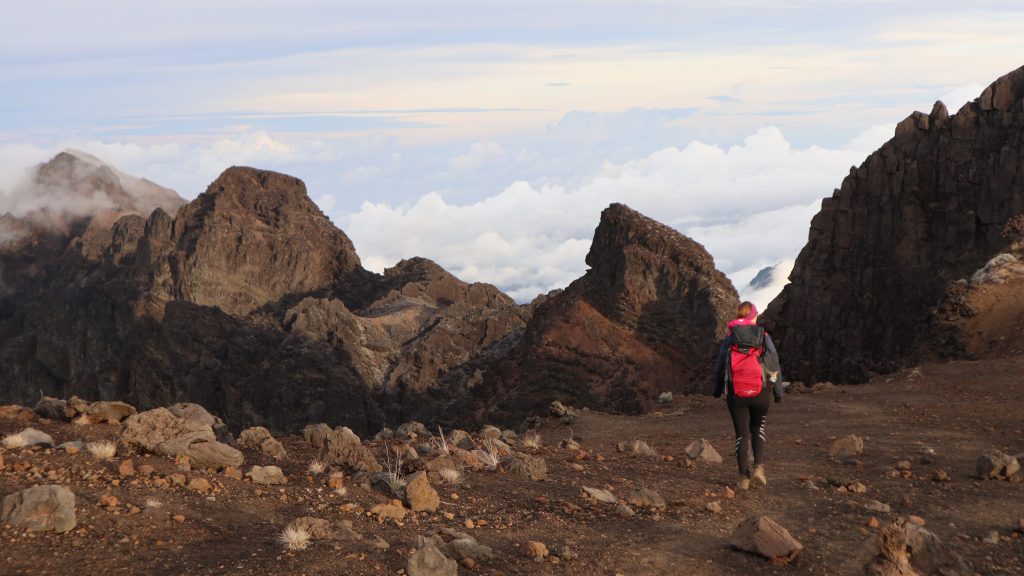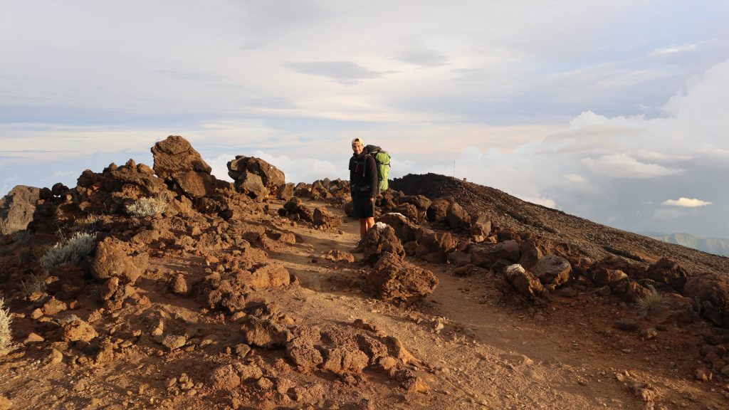 Ce serait mentir de dire que les 3 derniers kilomètres étaient les plus faciles… Cette portion, la deuxième partie du trajet, est bien différente. Plus vraiment des marches mais plutôt des blocs sur lesquels il faut sauter en suivant les traces blanches, puis des petits gravillons et de la terre. La montée est régulière et emmène, depuis le gîte, en une heure environ au sommet. La flore se fait de plus en plus rare. Les photos qui suivent ont été prises le lendemain matin, dans la redescente :