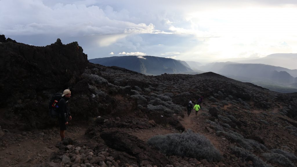 Le chemin s’engouffre petit à petit dans le cirque de Mafate et offre des vues incroyables, qui donnent envie de s’arrêter à chaque minute pour les photographier. Difficile donc de faire un trail en maintenant son rythme ! Nous avons parcouru une vingtaime de kilomètres sur le chemin en courant, tout en appréciant la vue.