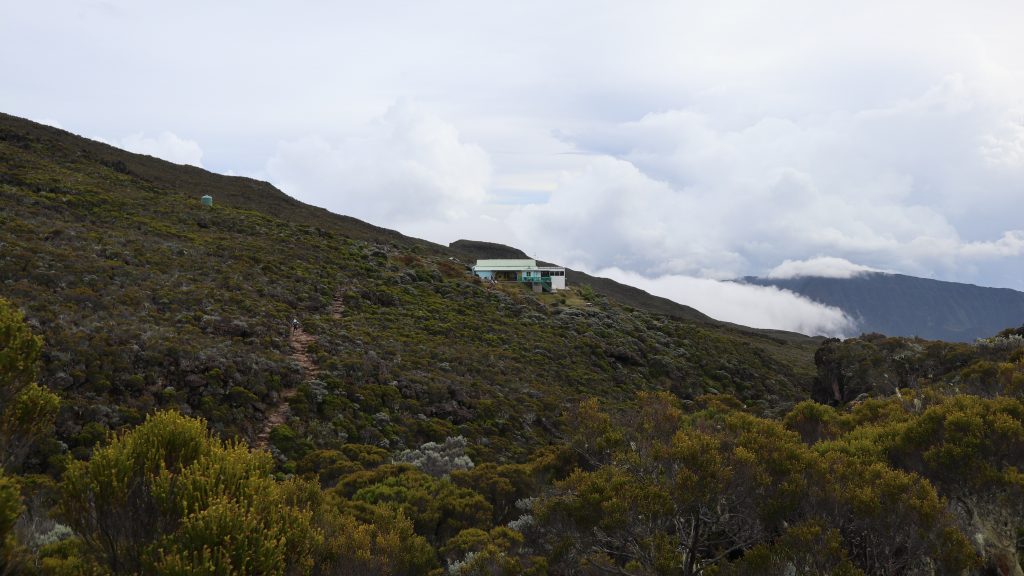 Le gîte de la Caverne Dufour. A gauche, la montée vers le sommet du Piton des Neiges…