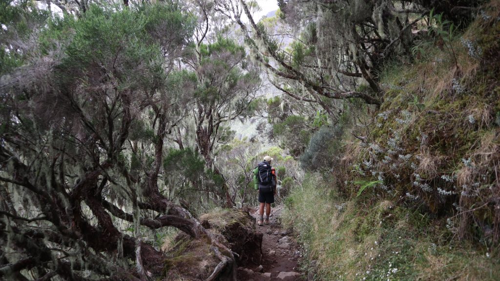 La nuit venait de tomber, nous nous sommes chacun équipés d’une lampe frontale, avons mis sur nos épaules nos sacs de trek (avec tente et matériel de camping dans celui de Thibault, vêtements et nourriture dans le mien) et nous nous sommes mis en route. Pas de surprise, la montée débute ILLICO ! La première partie de l’ascension, soit les 5km jusqu’au gîte, nous fait rencontrer tous les types de sentiers que l’on peut trouver à La Réunion : terre, marches en pierres (hautes, très hautes, moins hautes…), marches en bois, échelles métalliques… Qu’on se le dise, il n’y a pas de partie plate, seulement 2 ou 3 faux plats donnant l’espoir de pouvoir se reposer, mais ne durant, en fait, que l’espace de 30 petites secondes…