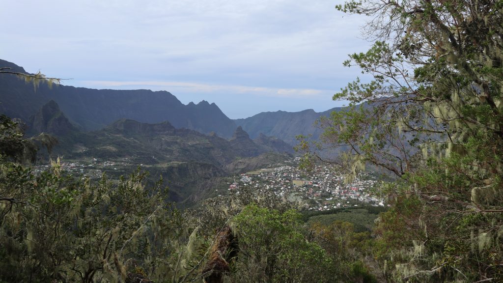 Toutefois, la descente offre quelques beaux points de vue sur Cilaos. Par ailleurs, la descente nous a aussi permis de nous rendre compte de ce que nous avions grimpé la veille en pleine nuit. Tiens, nous n’avions pas idée que c’était aussi pentu par ici, ohhh et nous n’avions pas vu ces jolis arbres ici !…