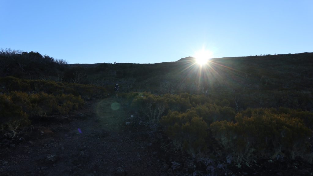 Revenant à la réalité après la contemplation (dans la chaleur !) de cette scène incroyable, nous avons enfilé nos lampes frontales et amorcé la descente du volcan. Le départ était plus pointu puisque nous étions sur la crête d’un ancien cratère, sans véritable chemin tracé. Dans la nuit et les petits cailloux, nous sommes donc descendus trèèès lentement. Nous n’avions bien sûr pas oublié de nous retourner de temps en temps pour admirer encore ce spectacle grandiose !