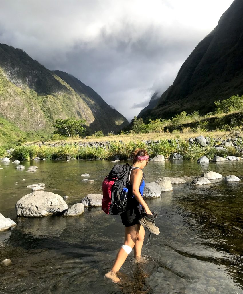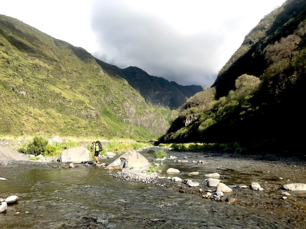 Avec un gros sac de trek dans le dos, il est facile de perdre l’équilibre, et si l’on ne veut pas finir à l’eau, il est préférable de se mouiller les pieds (parfois jusqu’aux genoux) et traverser la rivière directement. Avec Thibault, nous avions prévu le coup et pris avec nous nos chaussures d’eau, afin d’éviter de glisser sur les rochers vaseux au fond de la rivière, en la traversant.