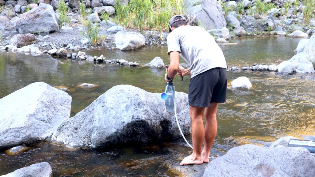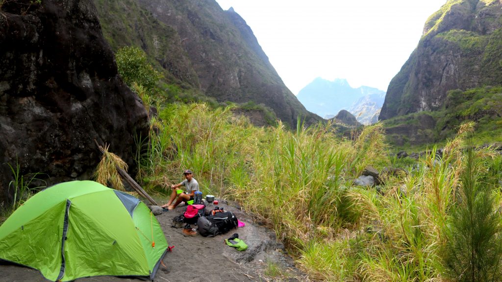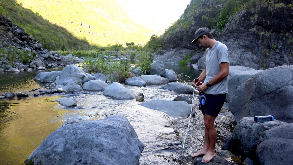 Après avoir installé notre tente et notre campement, nous nous sommes autorisés un petit bain rafraichissant dans la rivière, à la lumière de nos lampes frontales. Le petit plus que nous avons pu tester pour la première fois ici, c’est notre filtre à eau/purificateur d’eau. Nous avions investi il y a quelques temps d’un une pompe permettant de filtrer et purifier l’eau, afin d’avoir de l’eau potable en toutes circonstances. Dans un lieu comme l’île de La Réunion, où il fait très chaud, c’est indispensable. La pompe, en mettant le tuyau dans la rivière et l’embout d’arrivée dans nos gourdes, nous a permis de récolter de l’eau propre. Si vous voulez plus de renseignements sur le fonctionnement de notre purificateur d’eau, il s’agit de celui-ci.