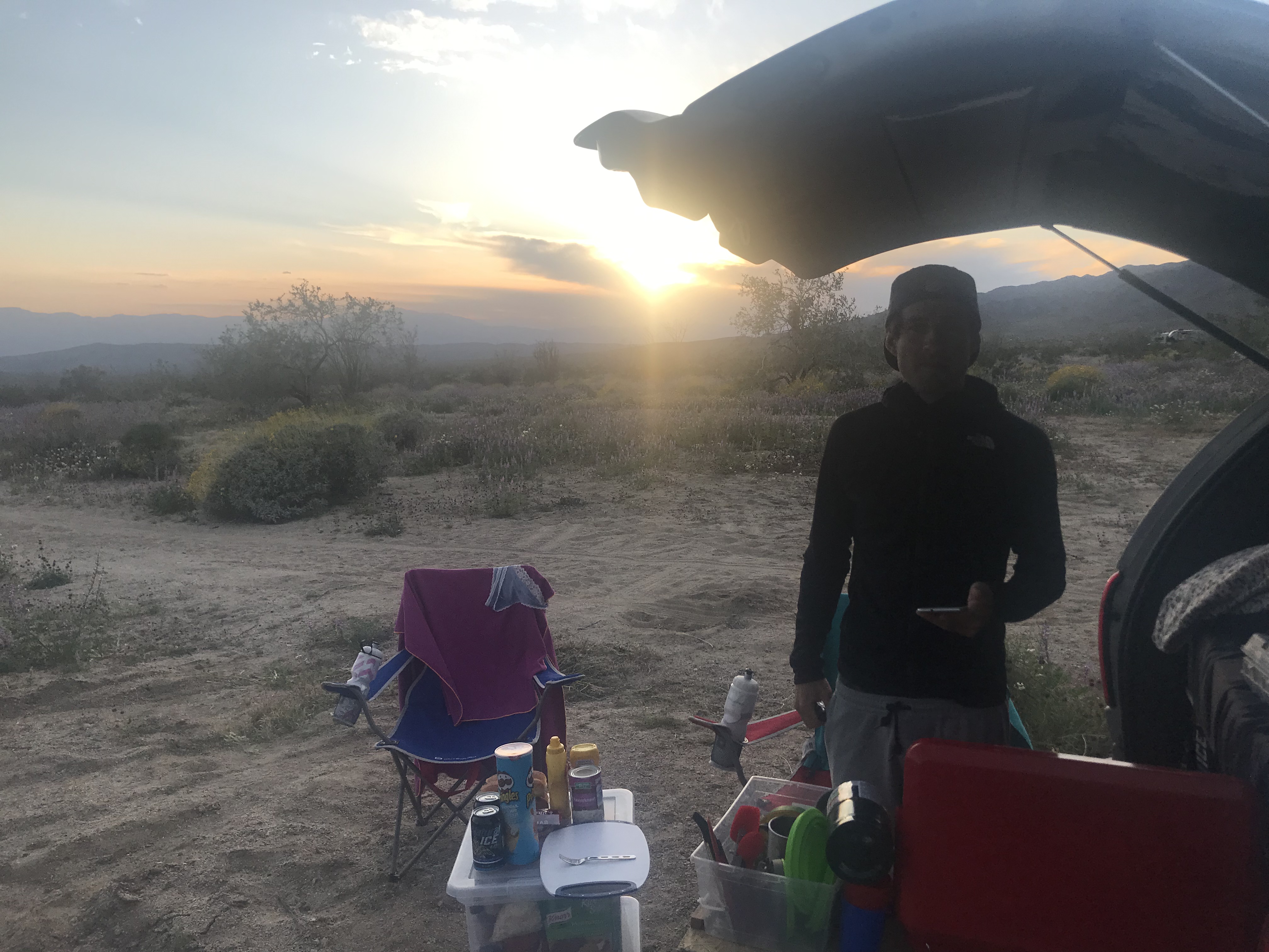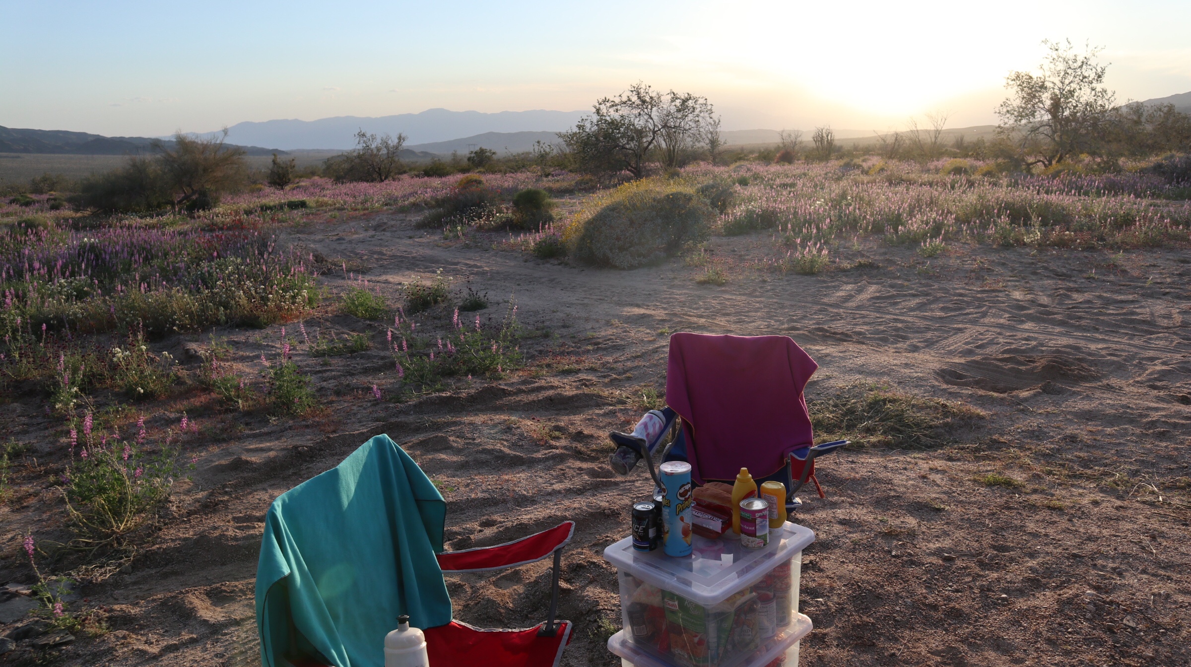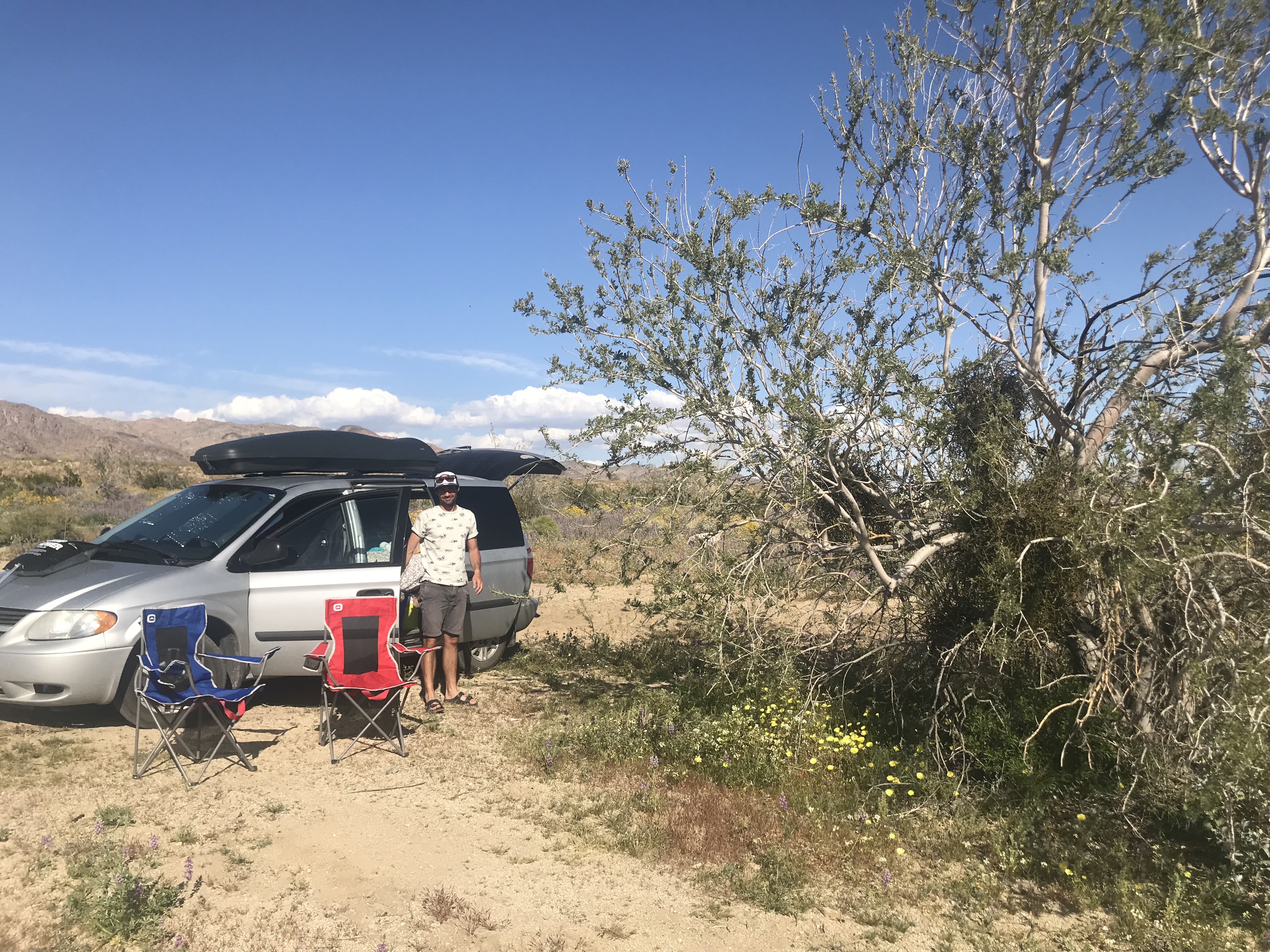 Où dormir : Il y a 8 campings dans le parc. Attention, ce sont des campings sommaires, qui bénéficient de toilettes seulement et dans lesquels on ne trouve pas toujours d’eau potable ! Au moment de notre visite fin mars, surprise, ils étaient tous complets ! Heureusement pour nous, cela nous a permis de trouver, tout juste après la sortie sud du parc, un emplacement parfait ! Beaucoup d’autres voyageurs en camping cars connaissaient déjà la combine puisque nous n’étions pas les seuls ! L’endroit était pour autant calme et agréable : nous étions entourés de fleurs qui distribuaient un doux parfum de printemps :