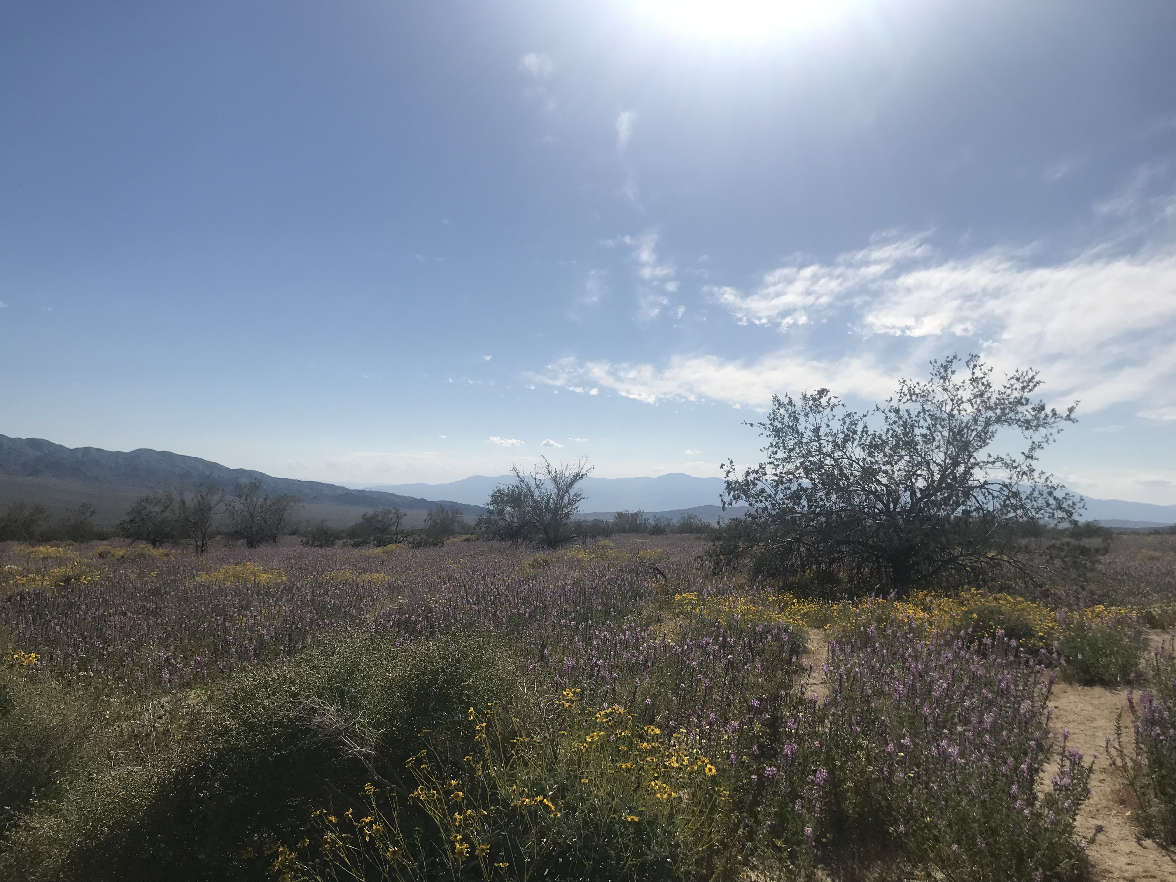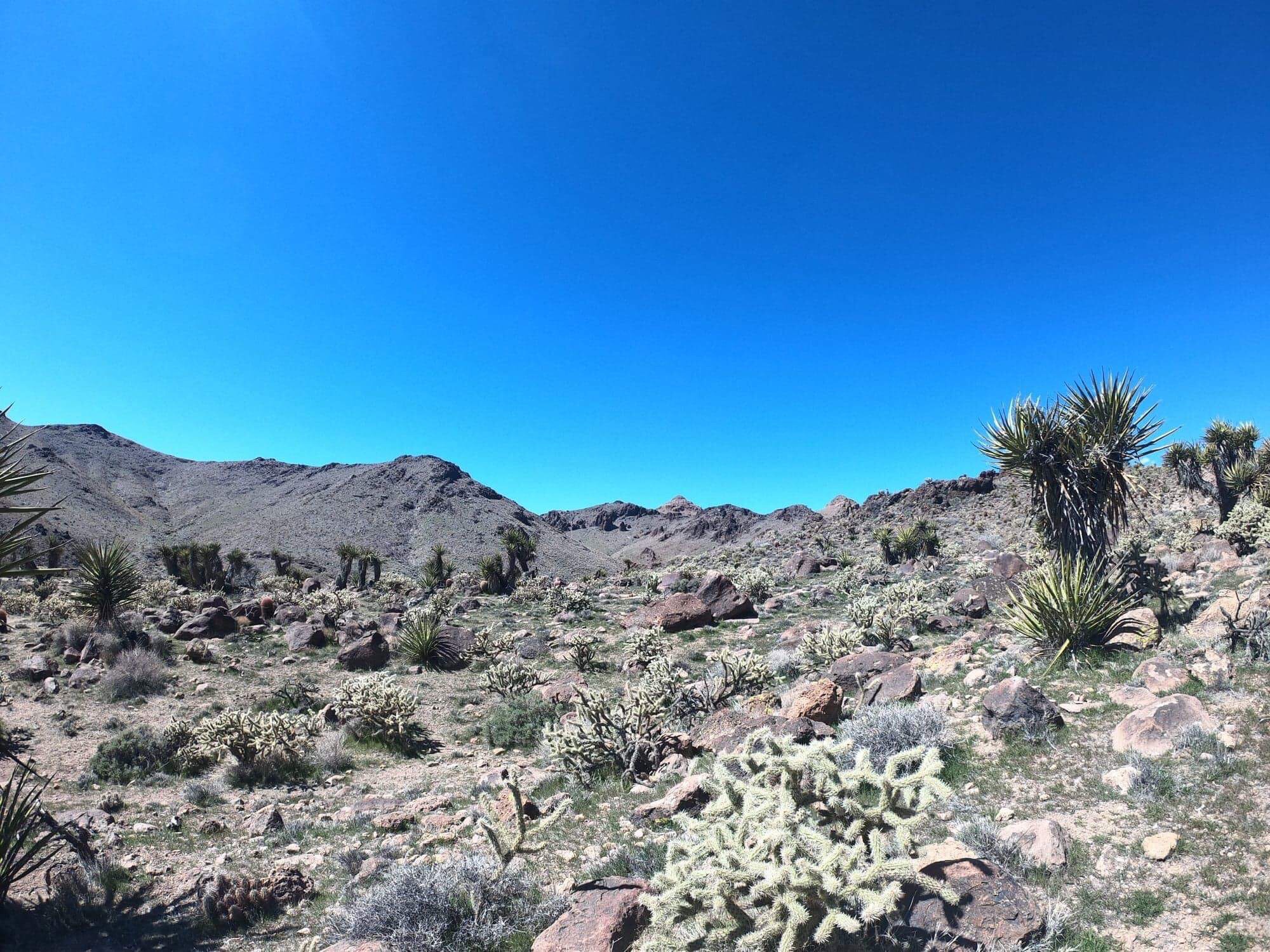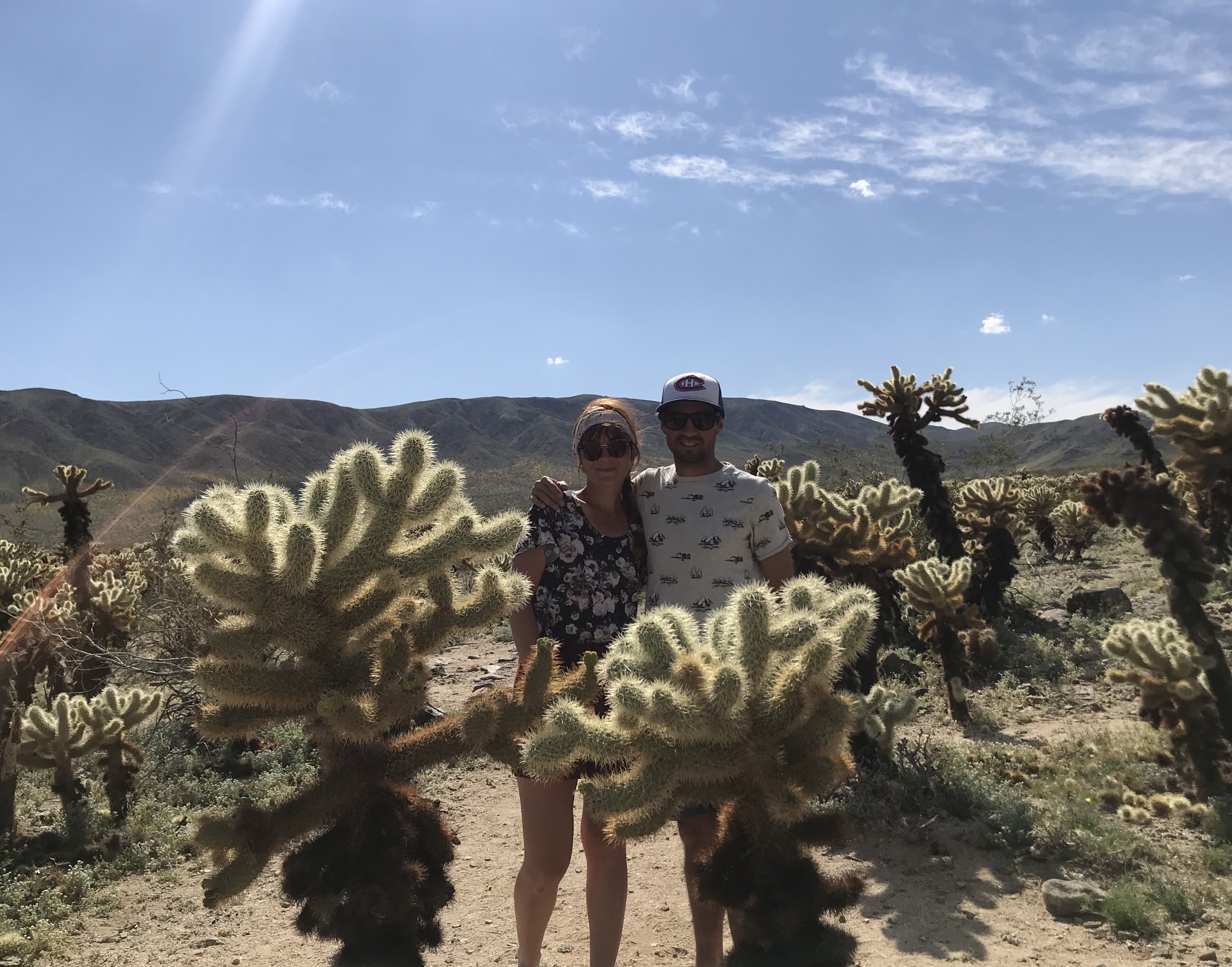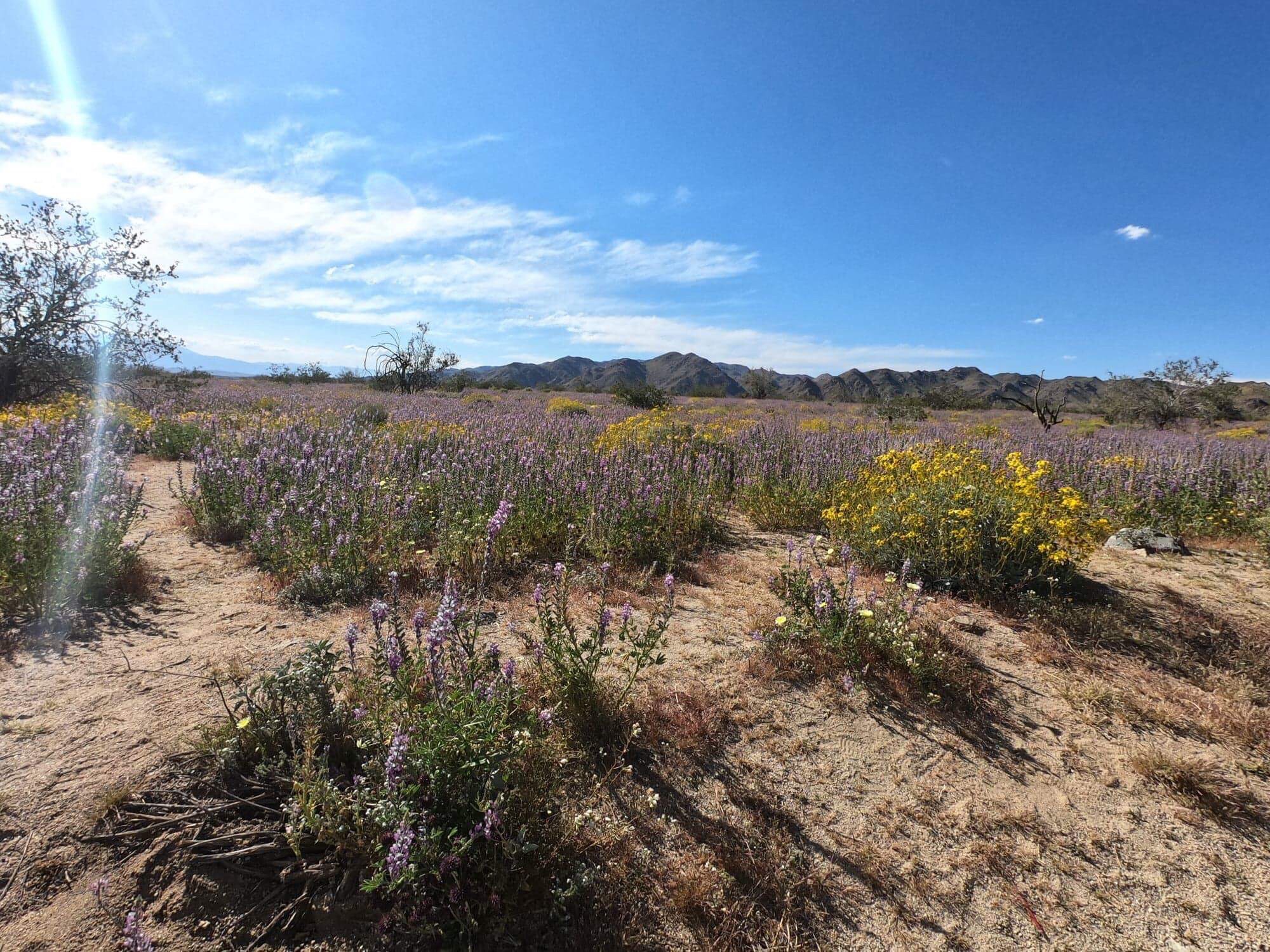 À faire : plusieurs randonnées sont aménagées dans le parc mais il n’est pas réputé pour le caractère incroyable de celles-ci. De notre point de vue, Joshua Tree est plus une invitation à flâner, s’arrêter dans les étendues de cactus, observer les fleurs qui y poussent au printemps, admirer les arbres de Joshua… bref, un parc où il fait bon vivre et profiter de la nature ! Les mois de mars et avril sont les plus propices pour une visite dans le parc car c’est à ce moment là qu’il est en fleurs. Une chance pour nous qui avons pu admirer cela ! La zone de Cottonwood Mountains tout au sud du parc est celle où l’on retrouve le plus de fleurs colorées :