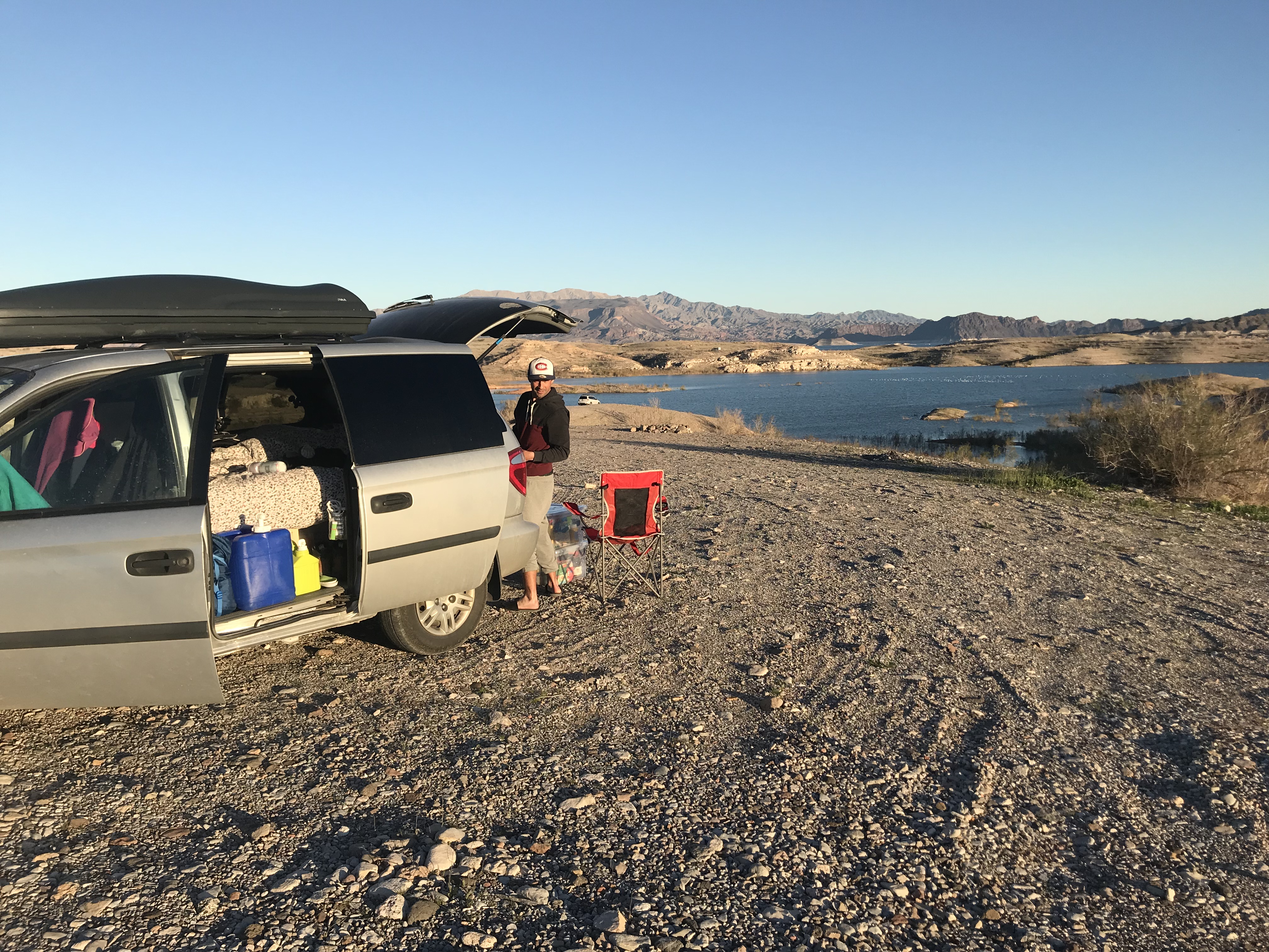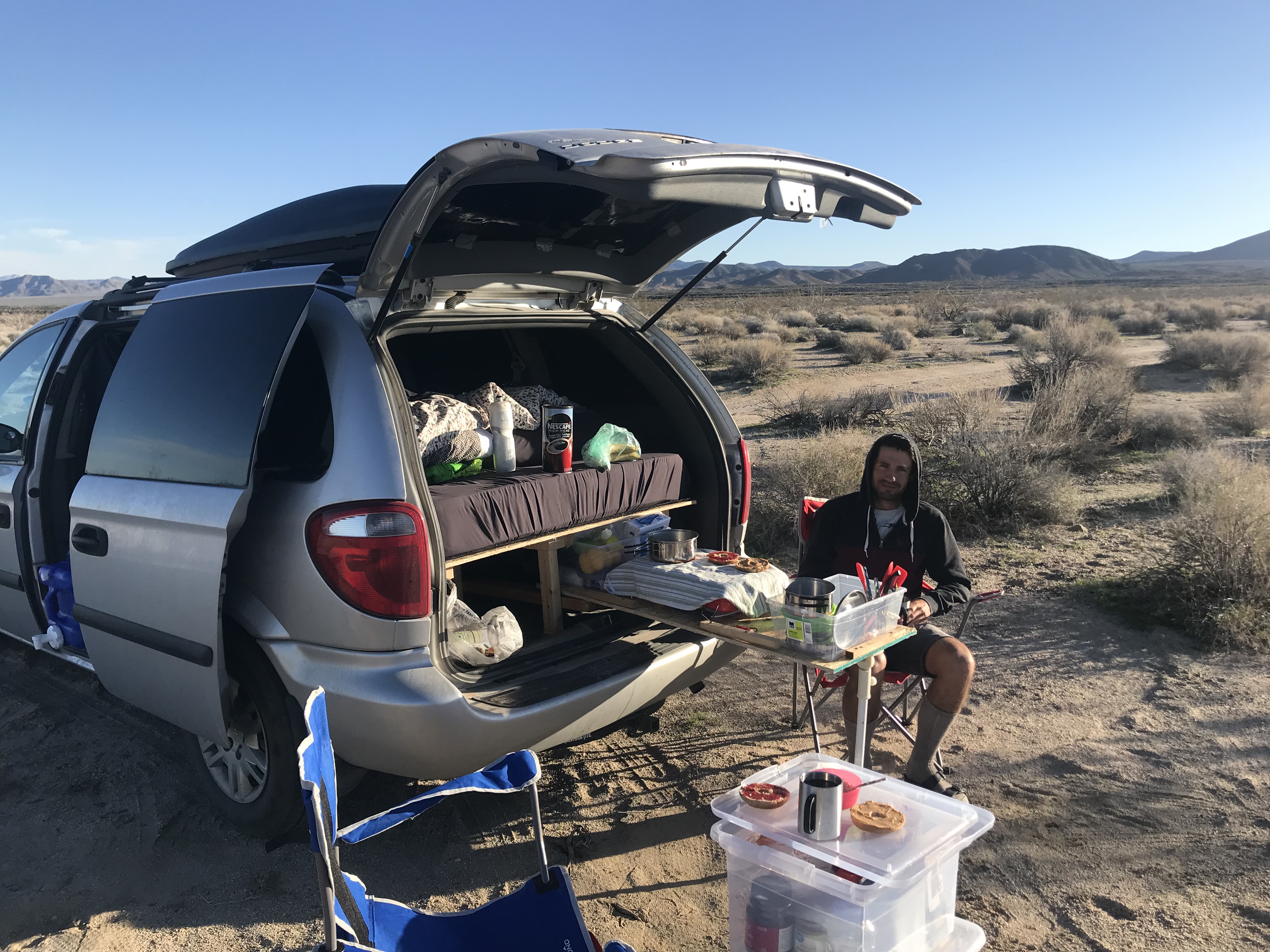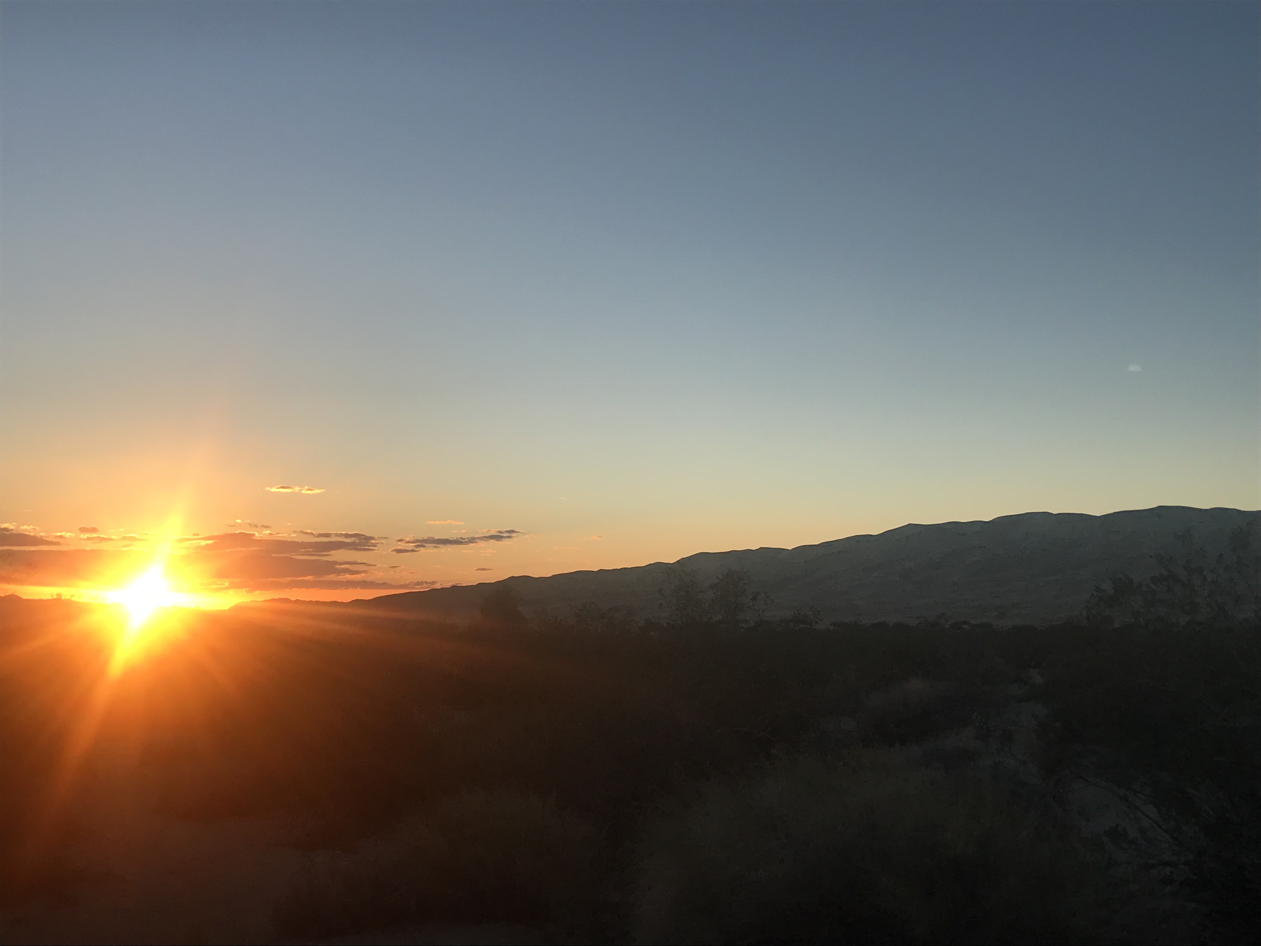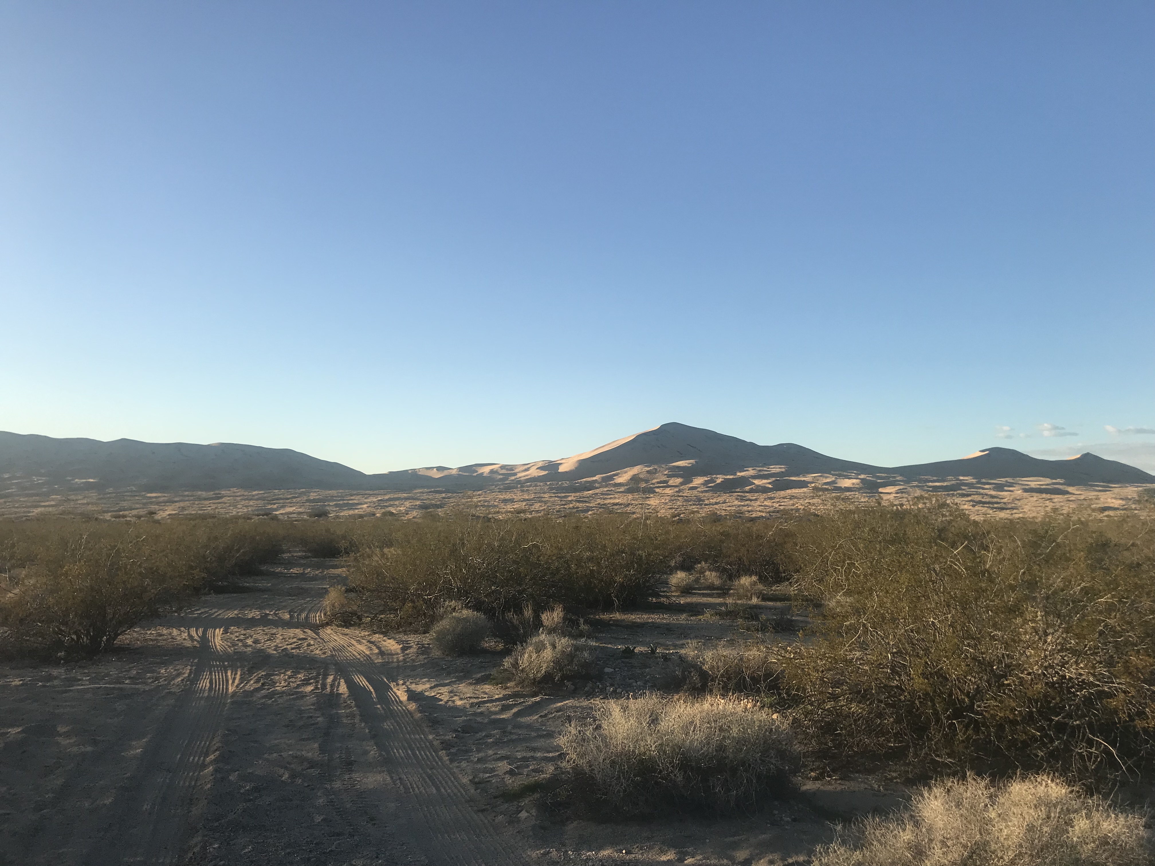 Il y a deux campings dans le parc mais honnetement, cela ne vaut pas la peine puisqu’ils ne fournissent rien de plus que des toilettes sèches et une table de pique nique. Autant trouver un bel endroit par soi-même ! Le deuxième soir nous trouvons un emplacement incroyable, que nous appellerons même « une pépite », au pied des dunes de sable (Kelso Dunes).