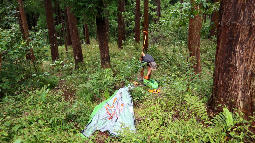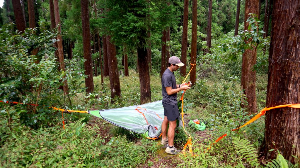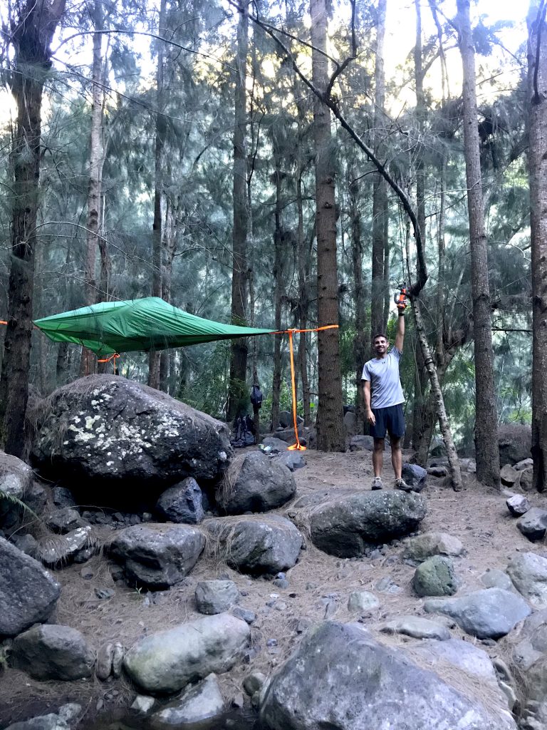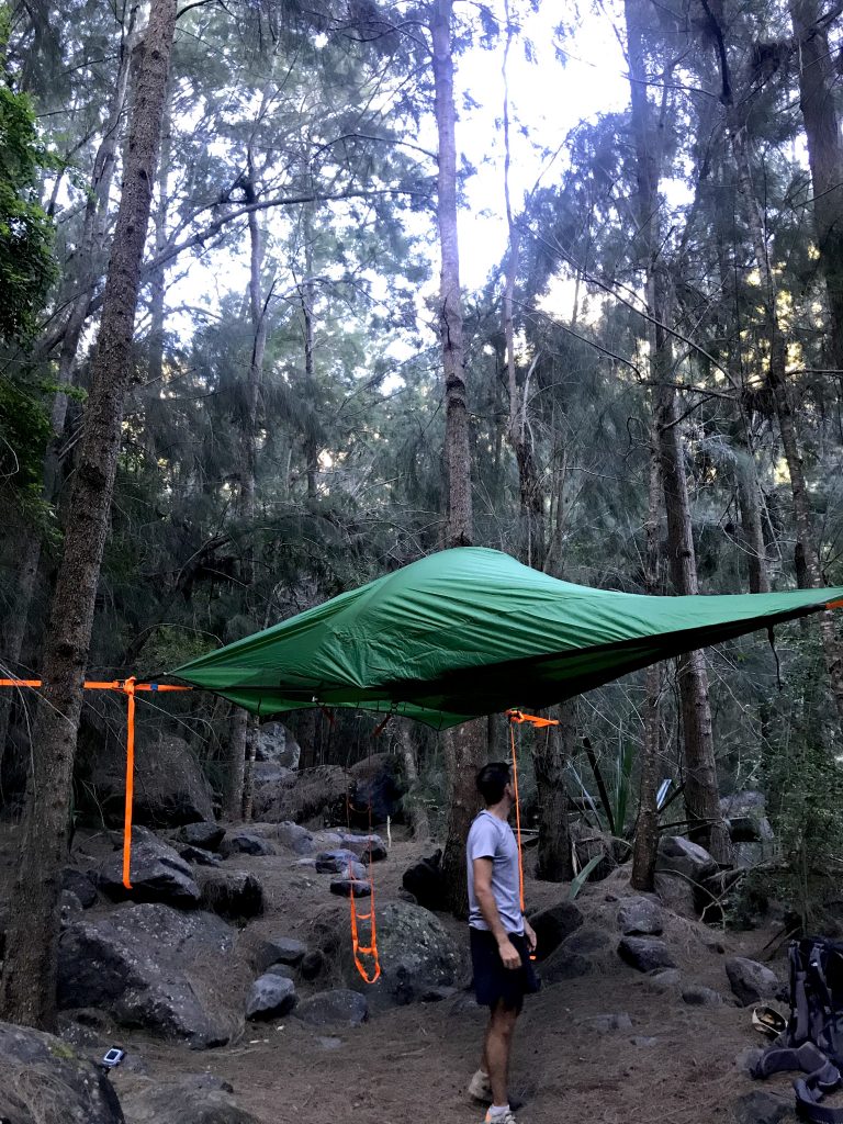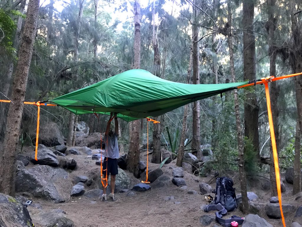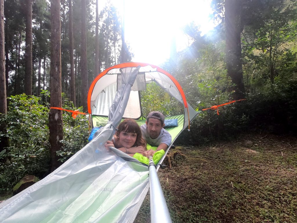 C’est donc lors de ce premier montage que nous avons dû faire et défaire la tente, avant de finalement repérer les « bons » arbres. Désormais, nous avons un meilleur coup d’oeil et repérons plus facilement quel endroit fera l’affaire. La tente se monte alors en seulement quelques minutes.