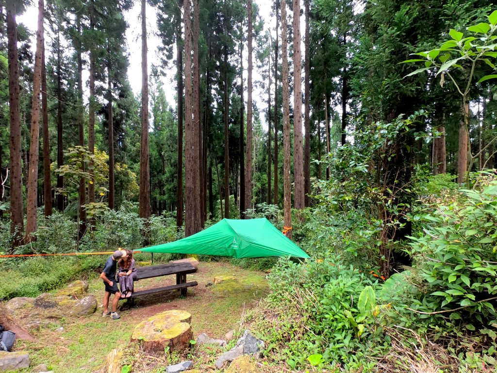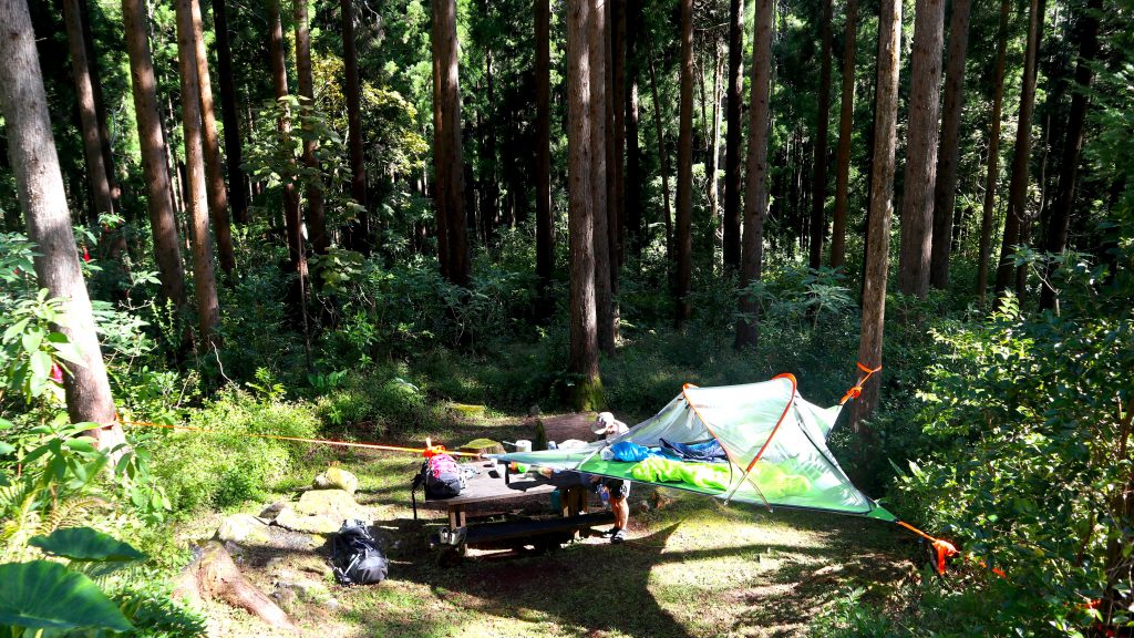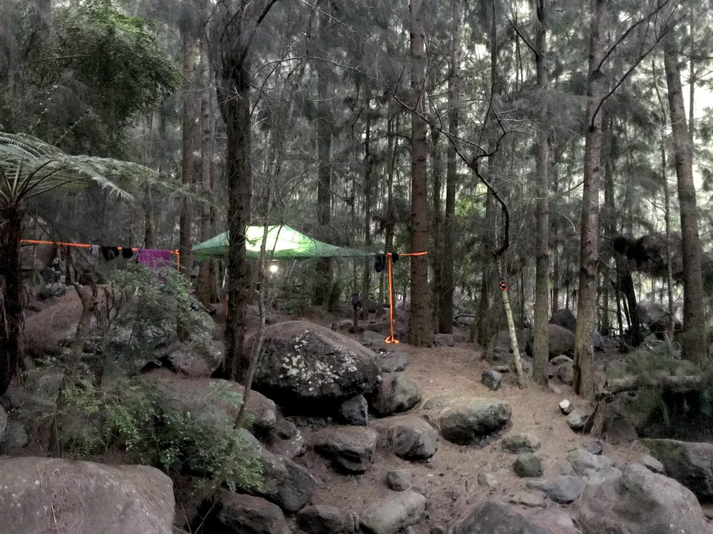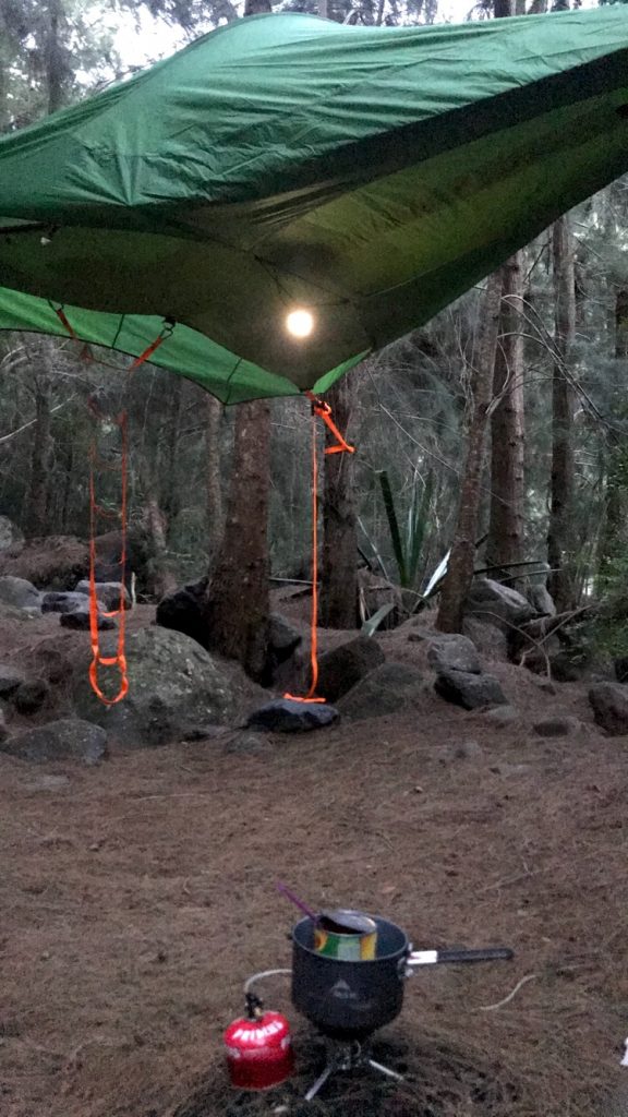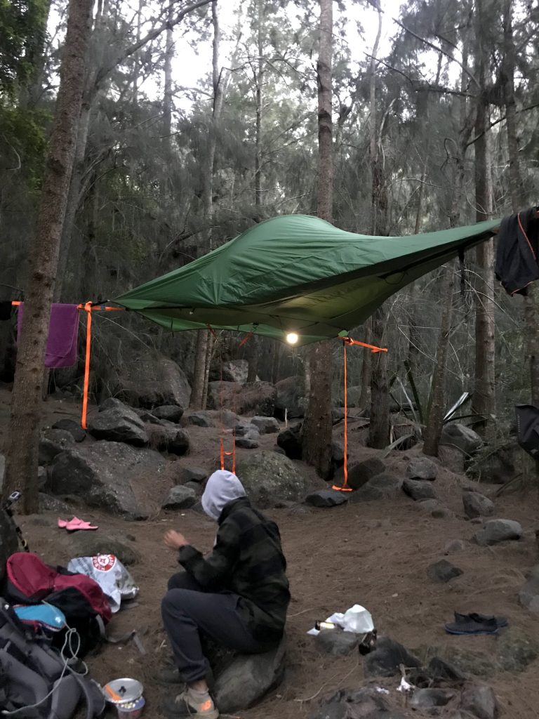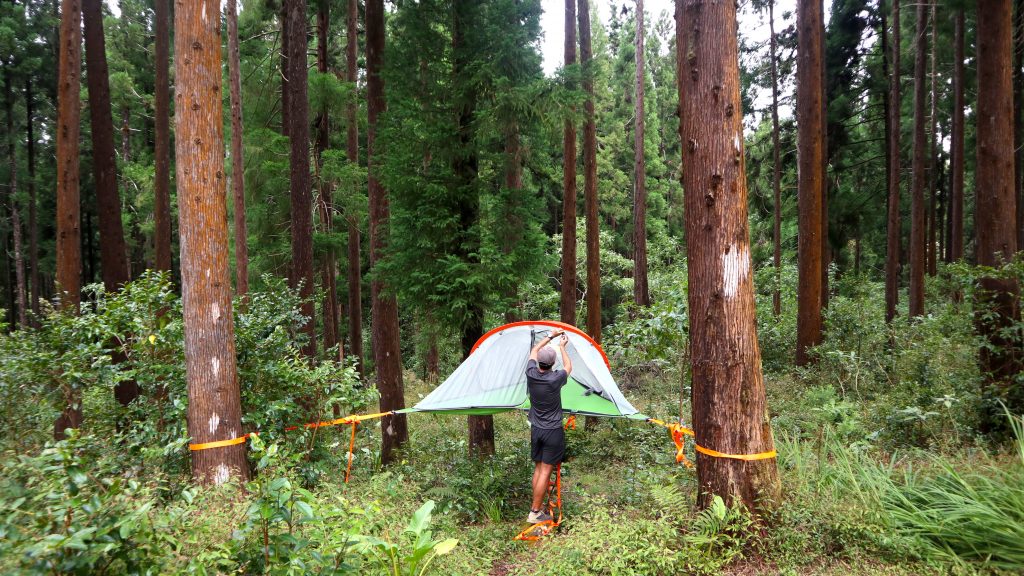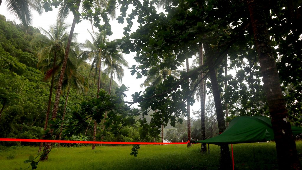 C’est donc lors de ce premier montage que nous avons dû faire et défaire la tente, avant de finalement repérer les « bons » arbres. Désormais, nous avons un meilleur coup d’oeil et repérons plus facilement quel endroit fera l’affaire. La tente se monte alors en seulement quelques minutes.