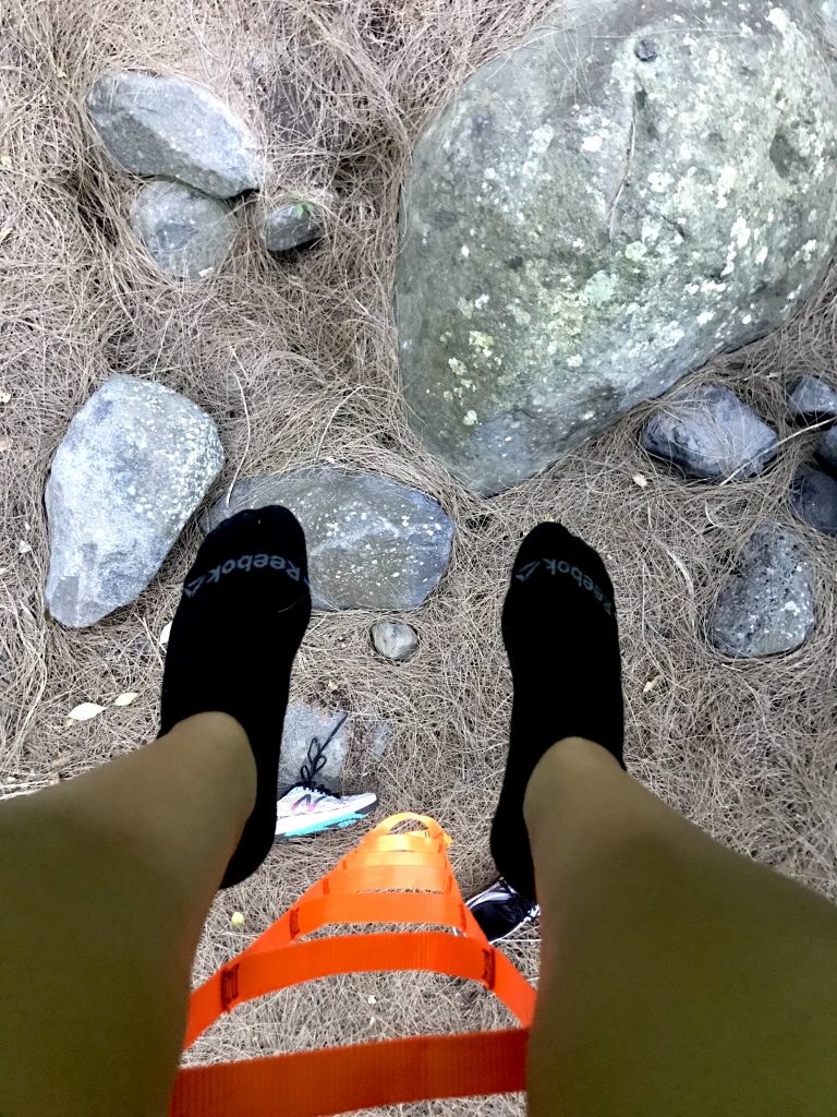 La première fois que nous l’avons installée a été plutôt…folklorique ! La tente est en forme de triangle, et nécessite donc 3 points d’ancrage. Dans l’idéal, il faut que les arbres ou poteaux auxquels on l’accroche soient positionnés en triangle isocèle. La nature étant rarement parfaite d’un point de vue géométrique, c’est plutôt difficile de trouver ça… Mais nous avons constaté, lors de cette première installation, que le plus important était d’abord de bien tendre le côté le plus court (celui par lequel on va monter, autrement dit la base du triangle). Il faut s’assurer que les sangles soient alignées avec les arceaux afin que la tente soit bien tendue et ne penche pas plus d’un côté que de l’autre. Cette étape est indispensable sinon, une fois à deux à l’intérieur, l’un va forcément tomber sur l’autre ! Par ailleurs, il faut également que les arbres soient à une certaine distance les uns des autres, ni trop près, sinon la tente ne sera pas assez tendue, ni trop loin, sinon les sangles ne seront pas assez longues ! Elles font tout de même 6 mètres de long.