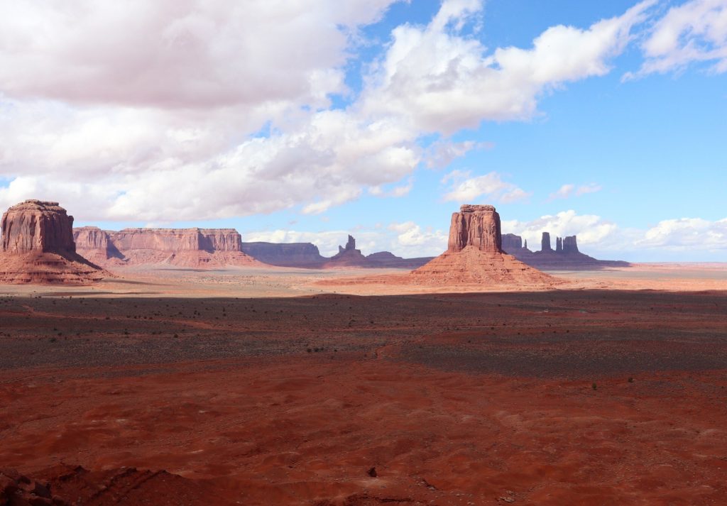 Une fois passé le guichet d’entrée, se trouve un grand parking ainsi que le visitor’s Center. Avancez-vous de quelques mètres et vous tomber sur la vue la plus connue (et certainement la plus photographiée !) de Monument Valley, face à East Mitten Butte (à gauche), Merrick Butte (au milieu) et Elephant Butte (à droite) :