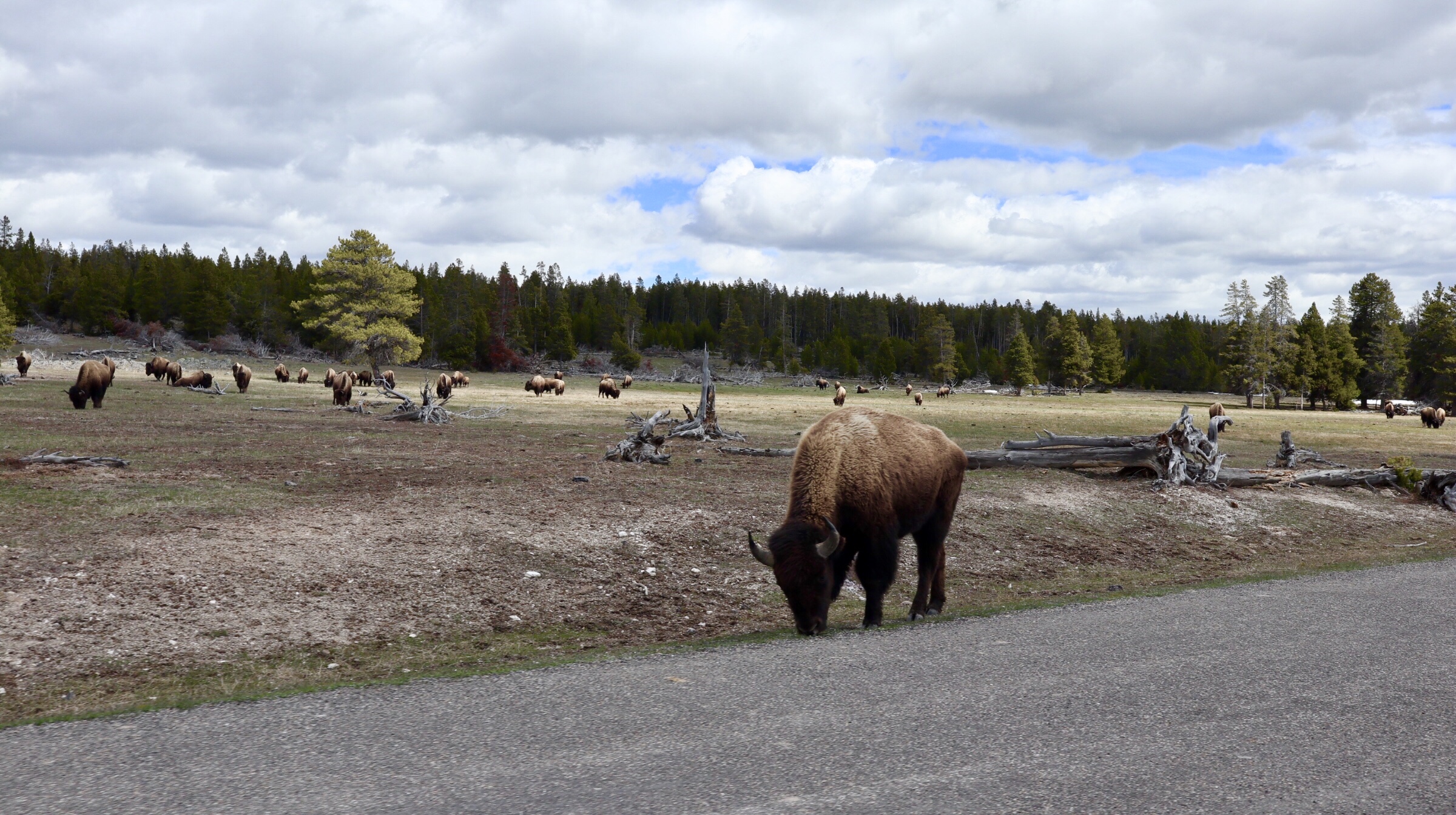 Nous qui pensions devoir tourner beaucoup avant d’en voir, nous avons été servis ! À Yellowstone, pas besoin de chercher beaucoup avant de voir des troupeaux de bisons, il y en a dans tous les coins.