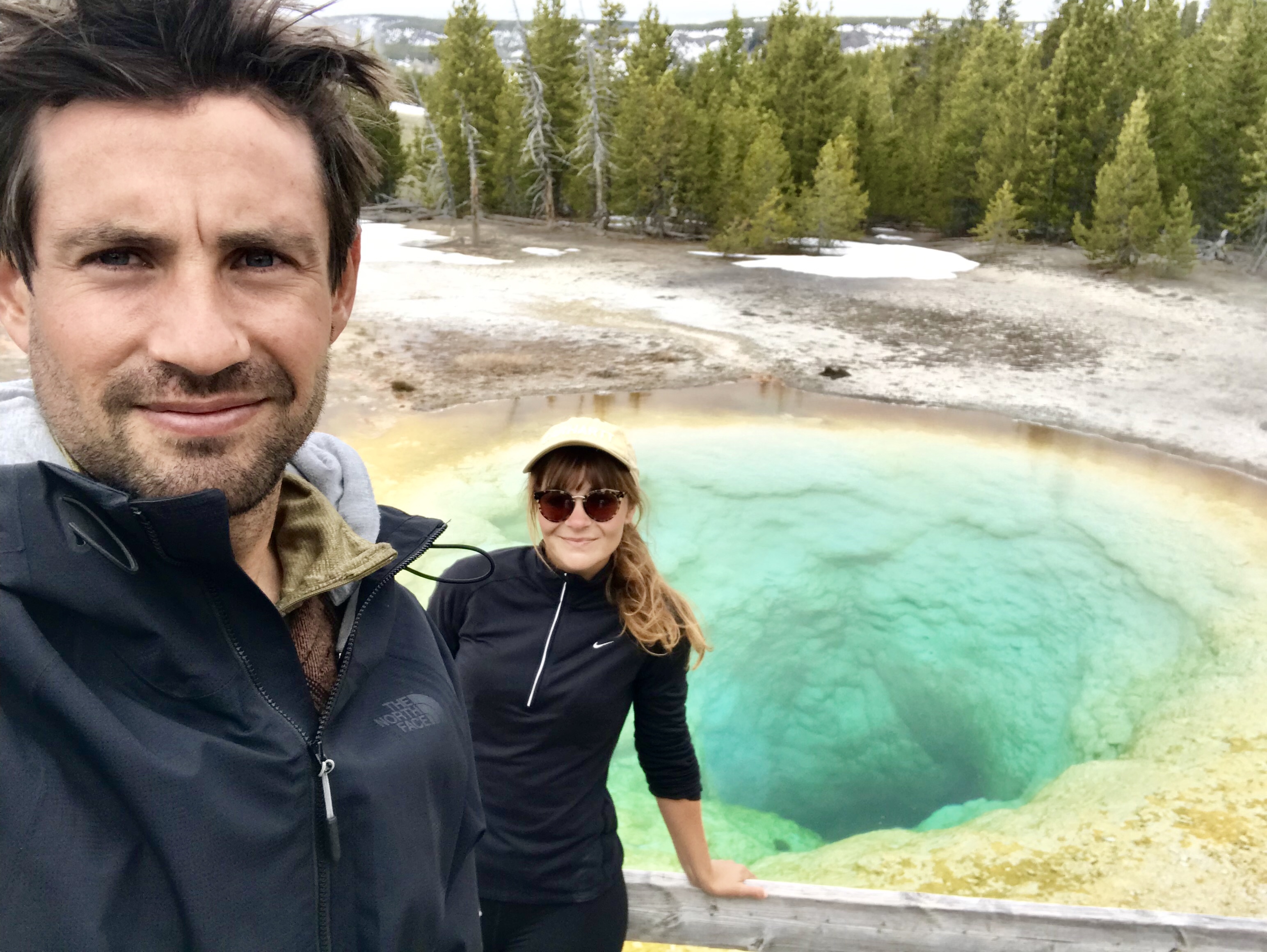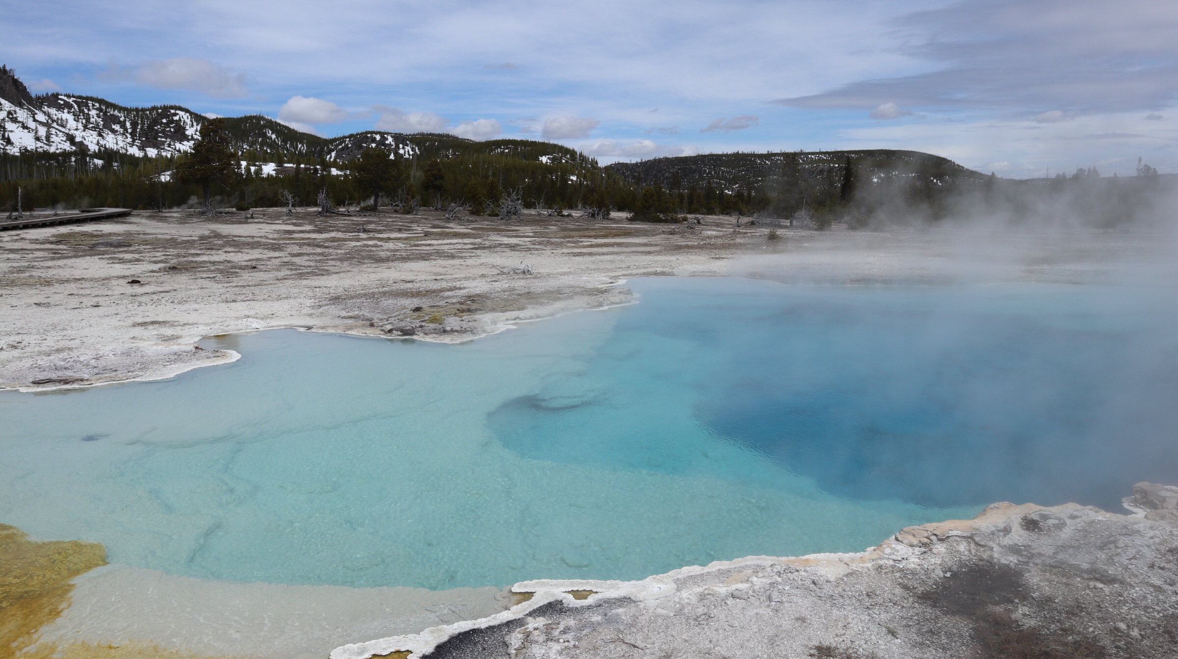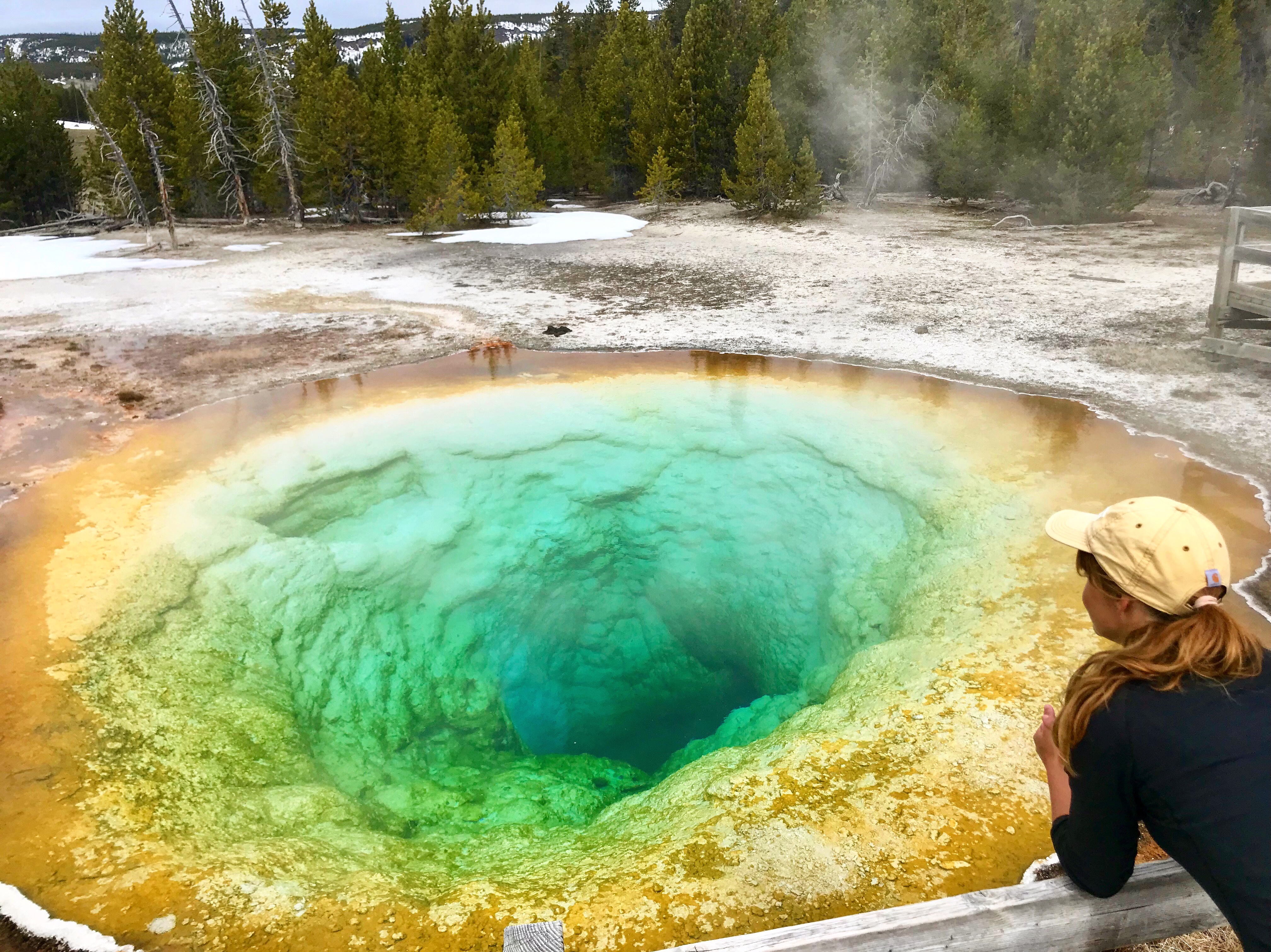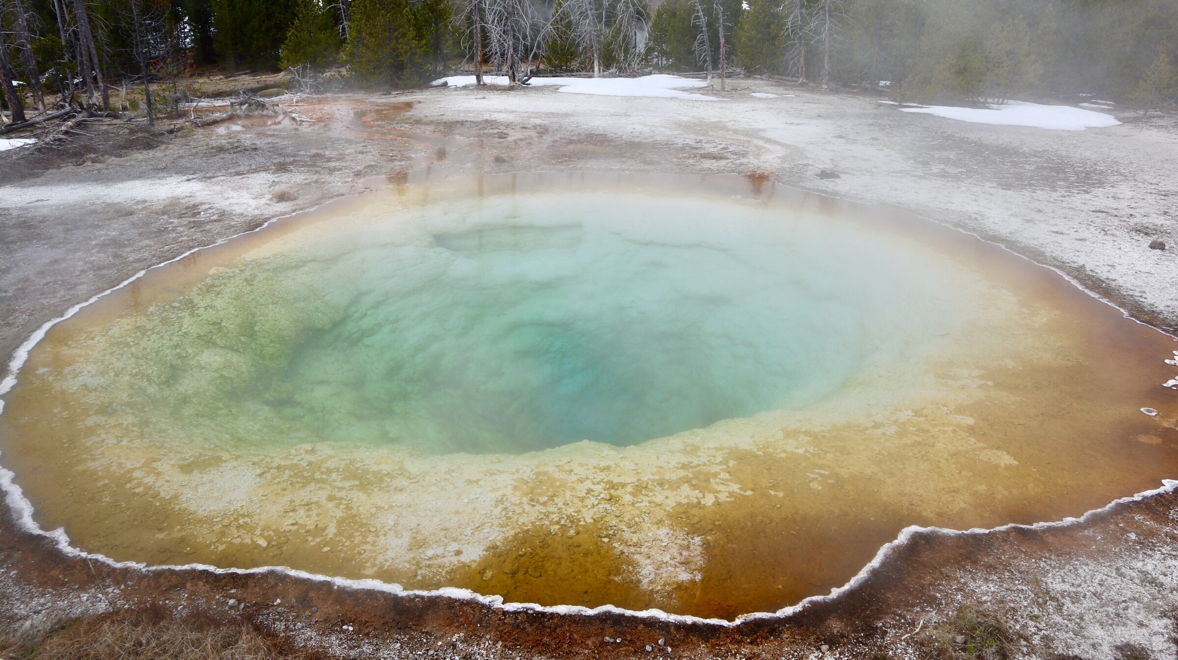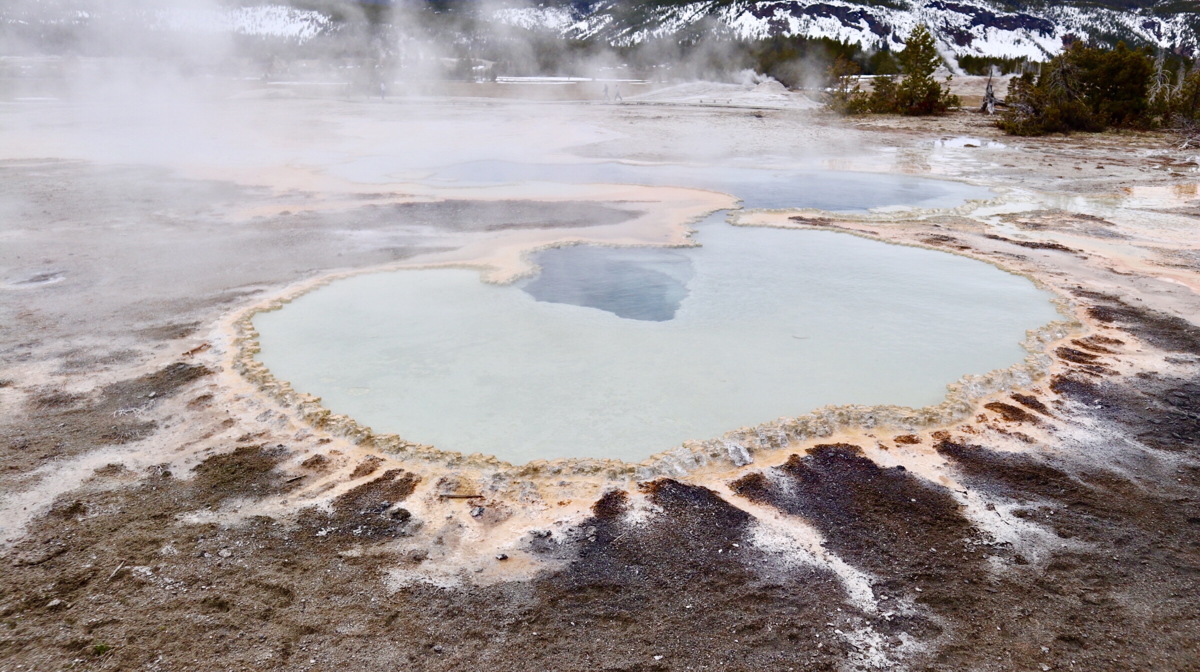 Le petit plus, c’est de pouvoir monter un peu en hauteur pour l’admirer du dessus et prendre toute la dimension de ses couleurs. Malheureusement, fin avril, les randonnées à Yellowstone sont pour la plupart encore fermées à cause de la neige, il nous a donc été impossible de nous y rendre.