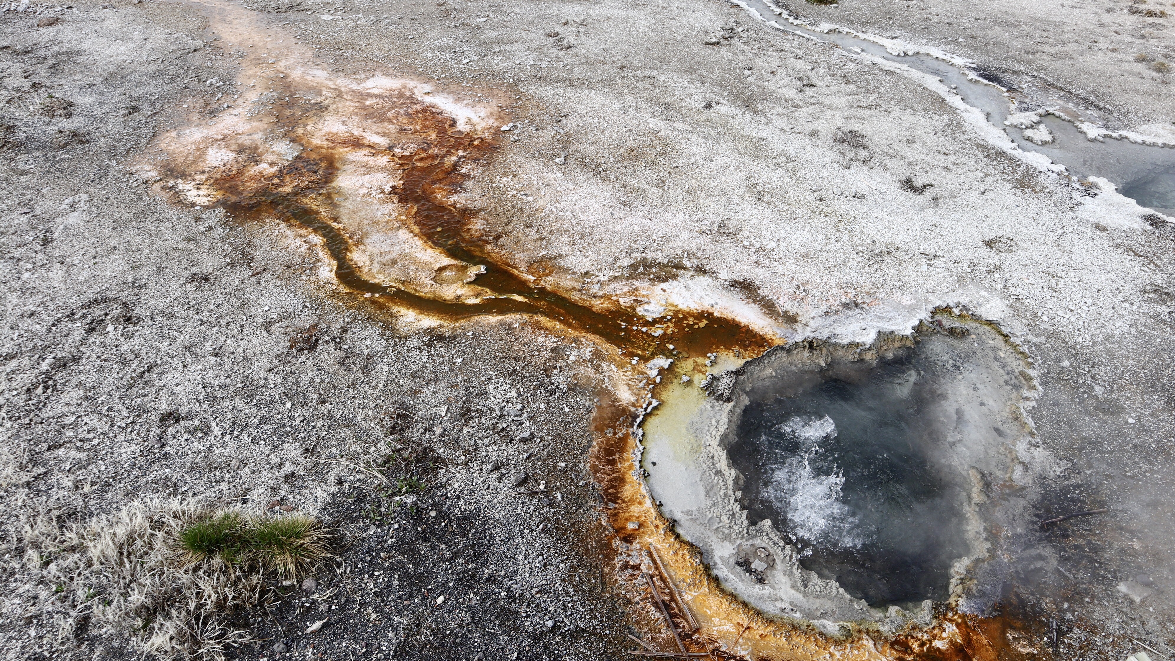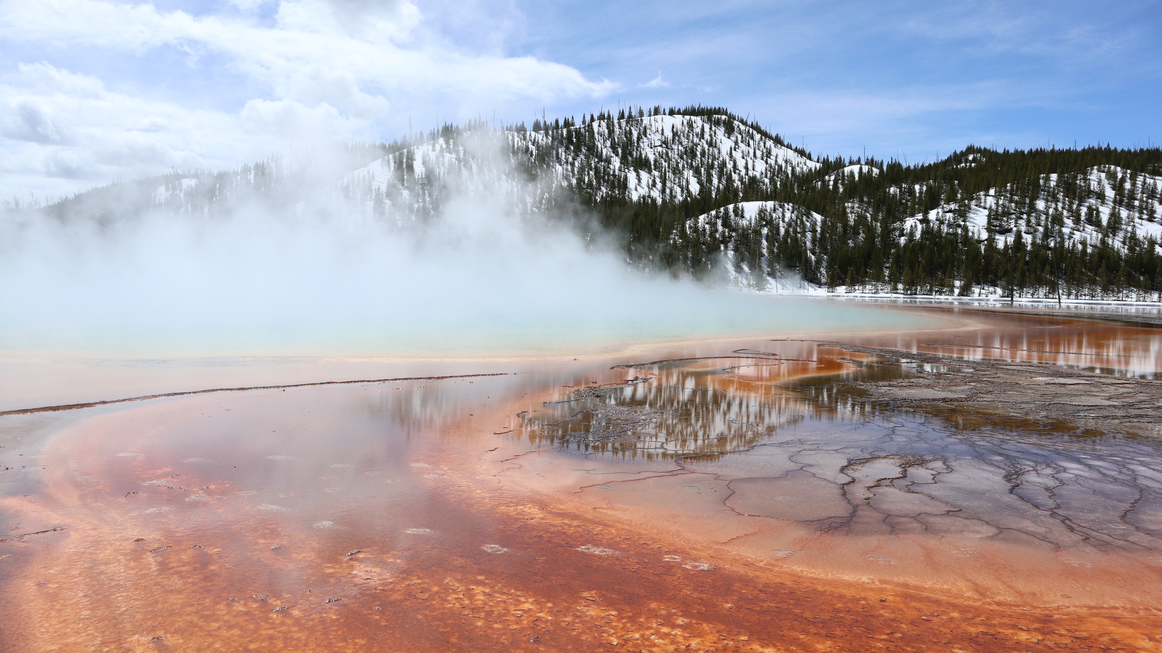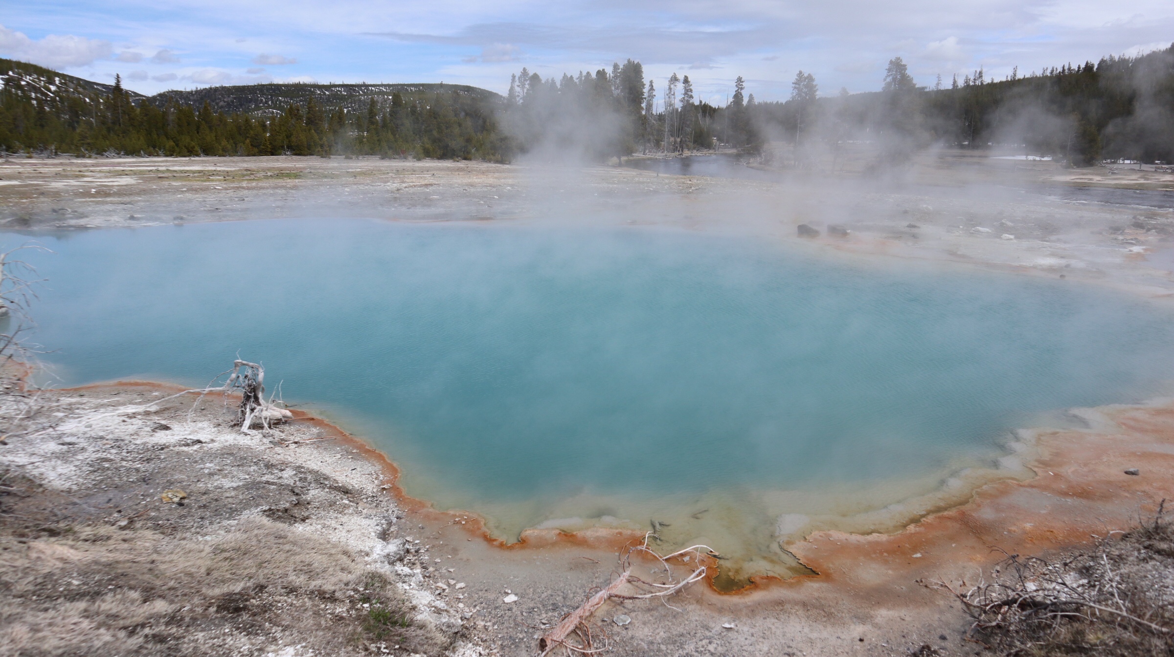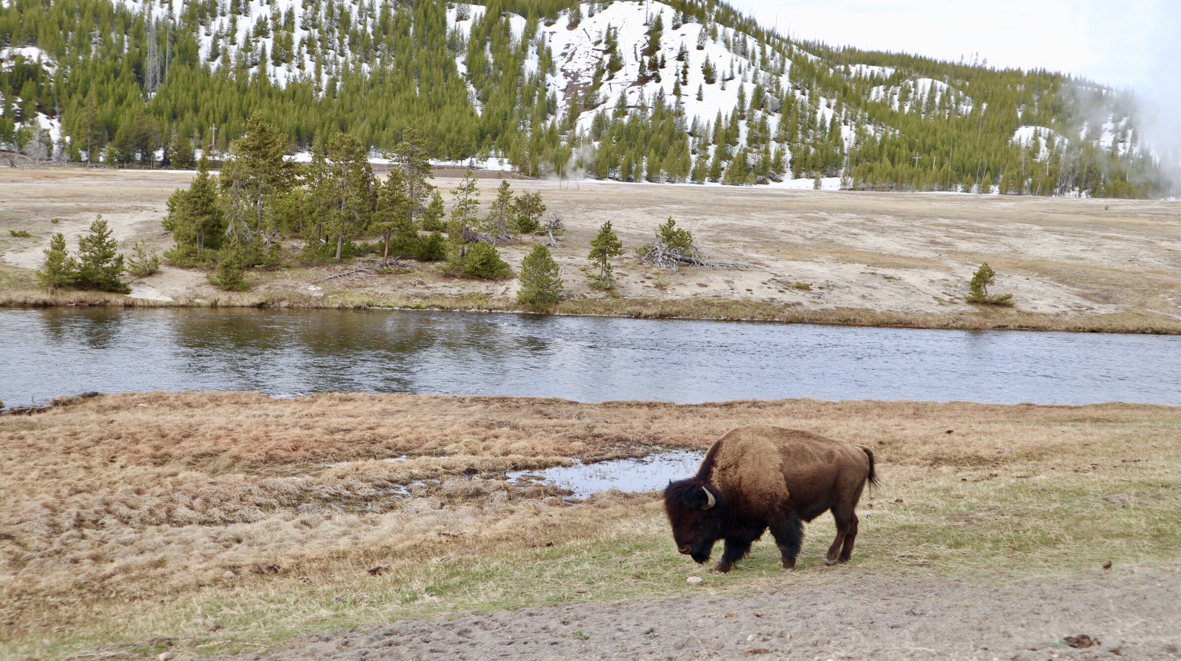 Le petit plus, c’est de pouvoir monter un peu en hauteur pour l’admirer du dessus et prendre toute la dimension de ses couleurs. Malheureusement, fin avril, les randonnées à Yellowstone sont pour la plupart encore fermées à cause de la neige, il nous a donc été impossible de nous y rendre.