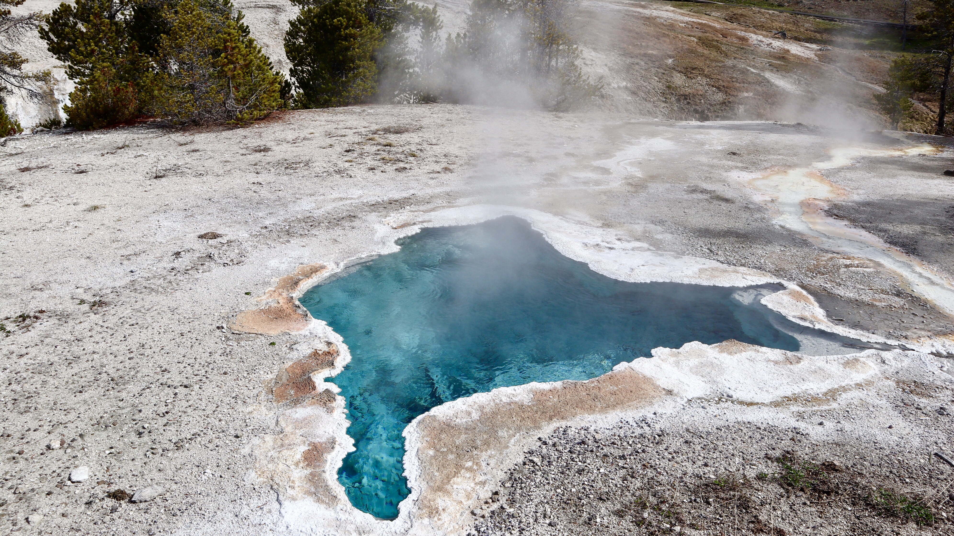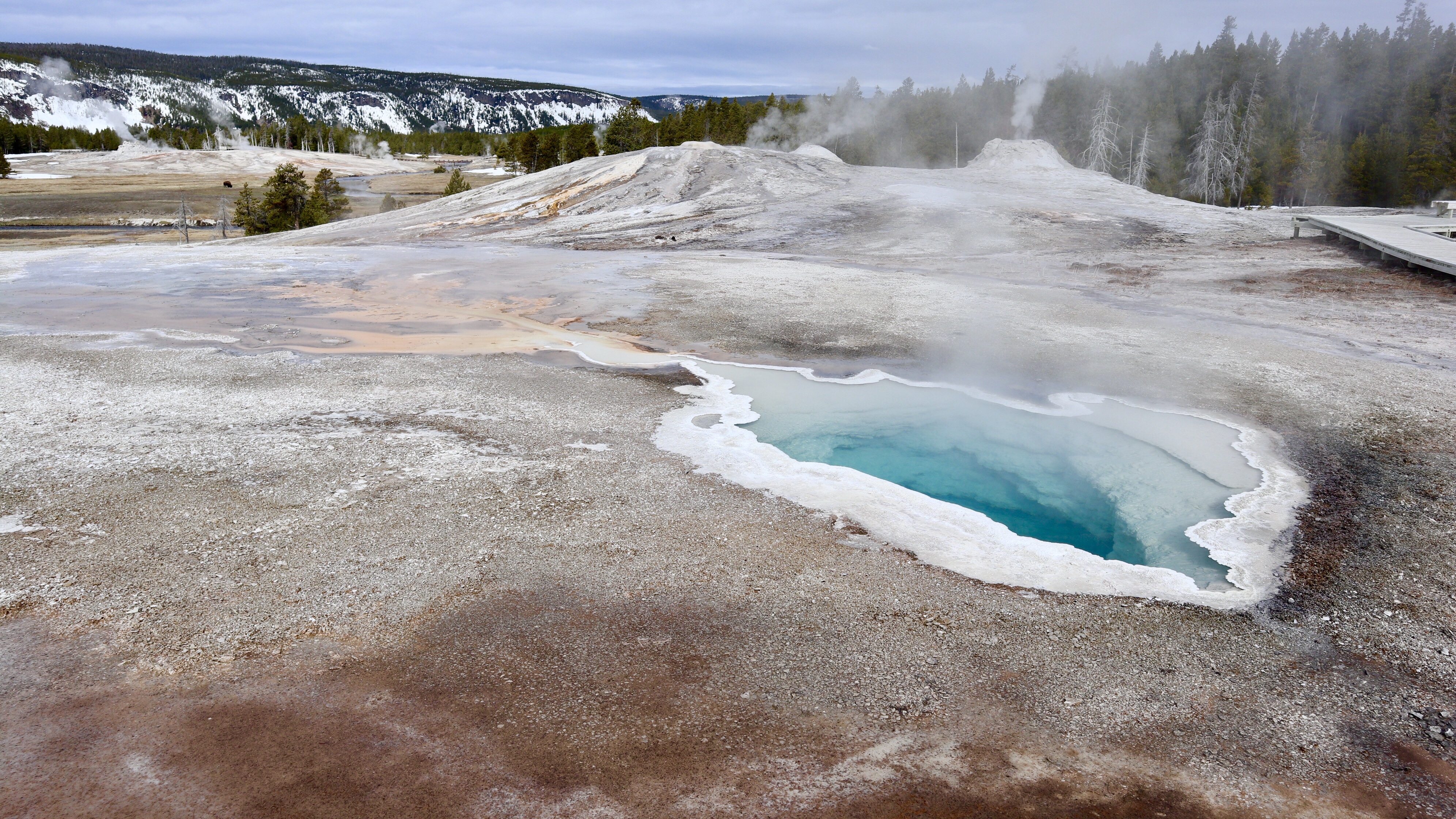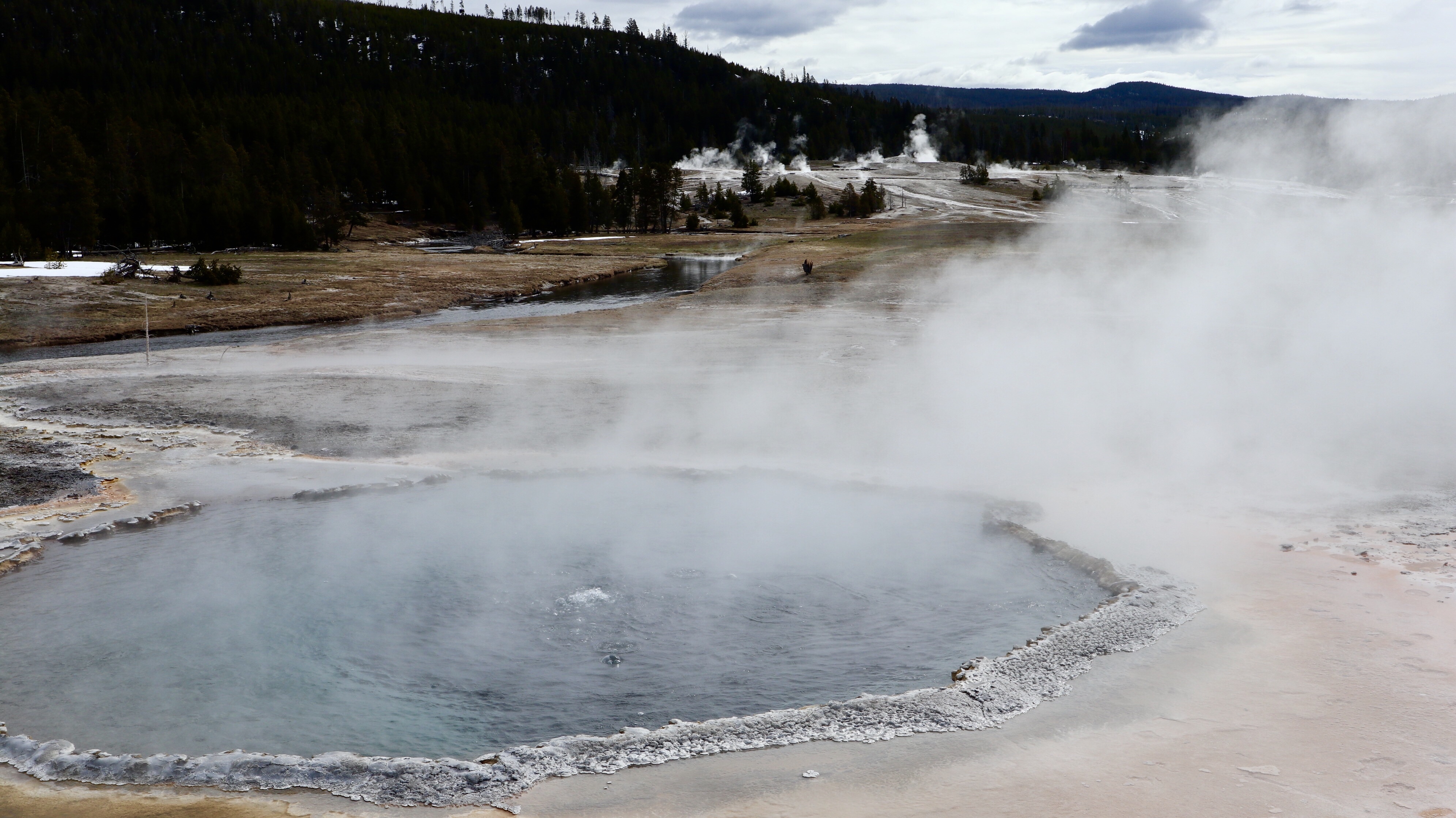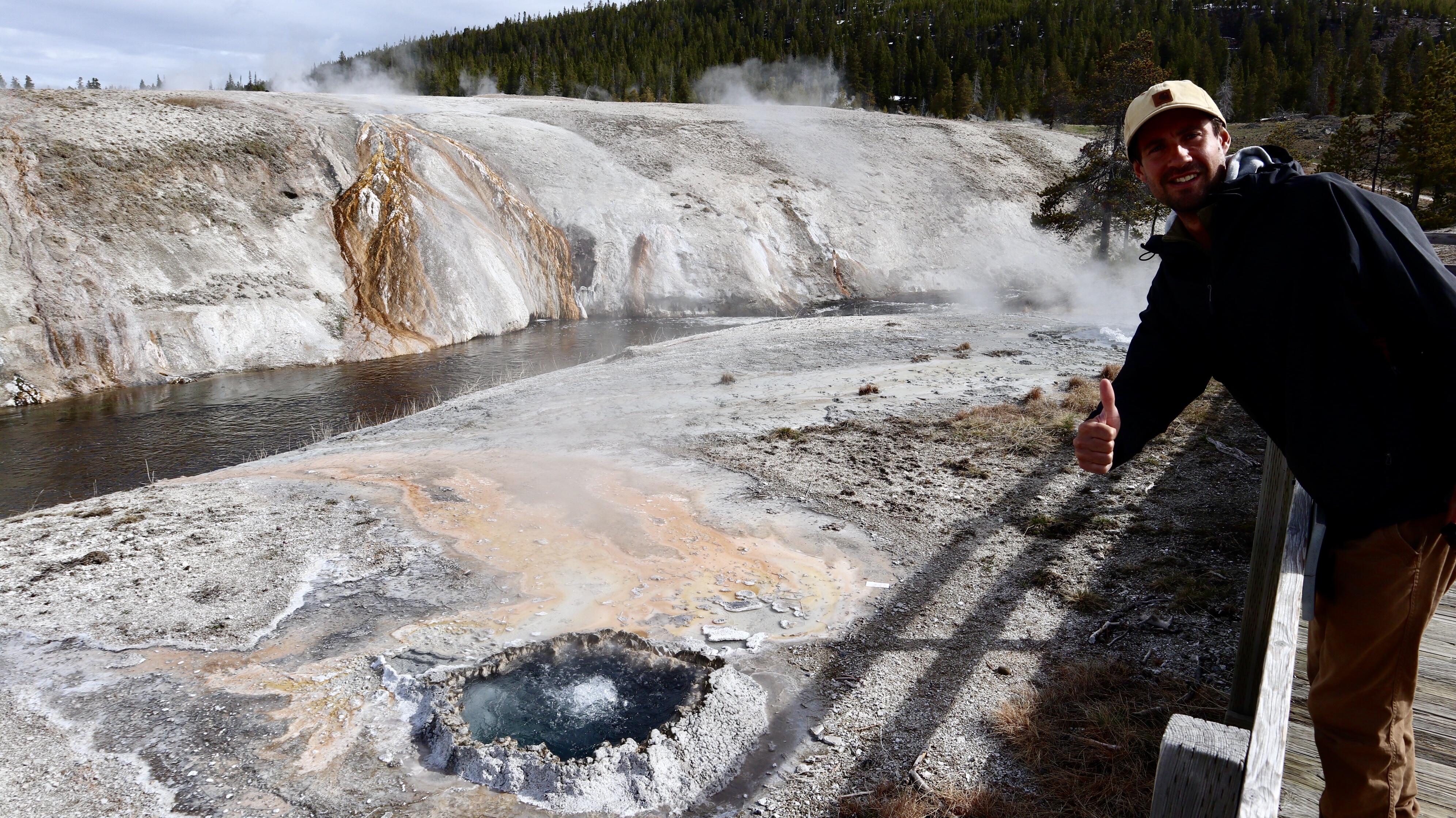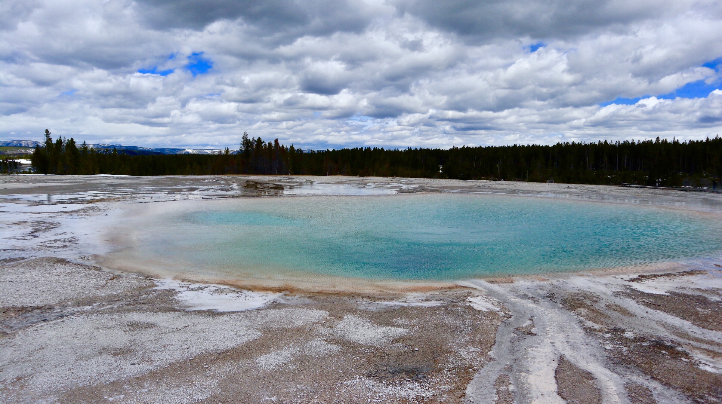 Le petit plus, c’est de pouvoir monter un peu en hauteur pour l’admirer du dessus et prendre toute la dimension de ses couleurs. Malheureusement, fin avril, les randonnées à Yellowstone sont pour la plupart encore fermées à cause de la neige, il nous a donc été impossible de nous y rendre.