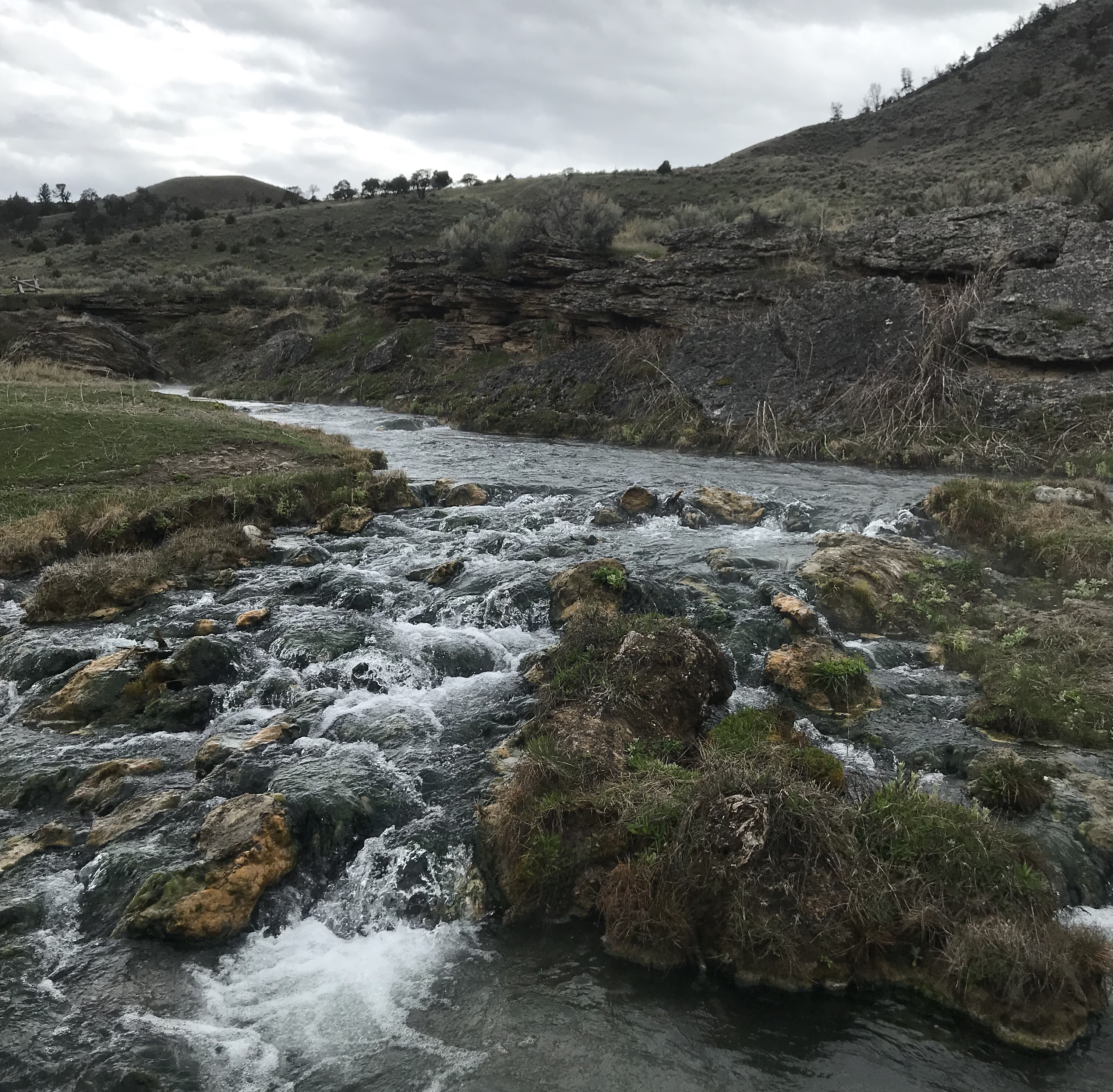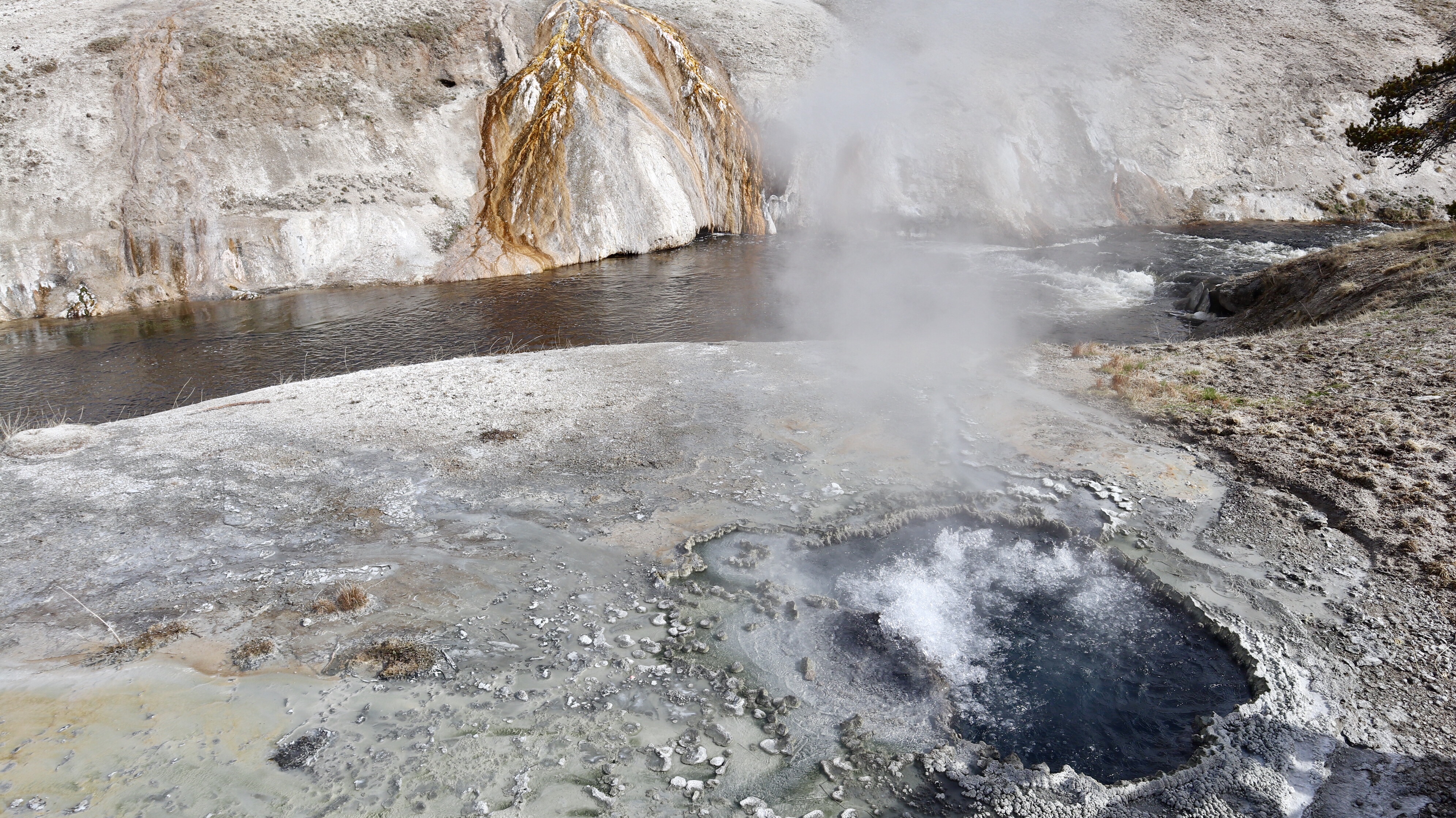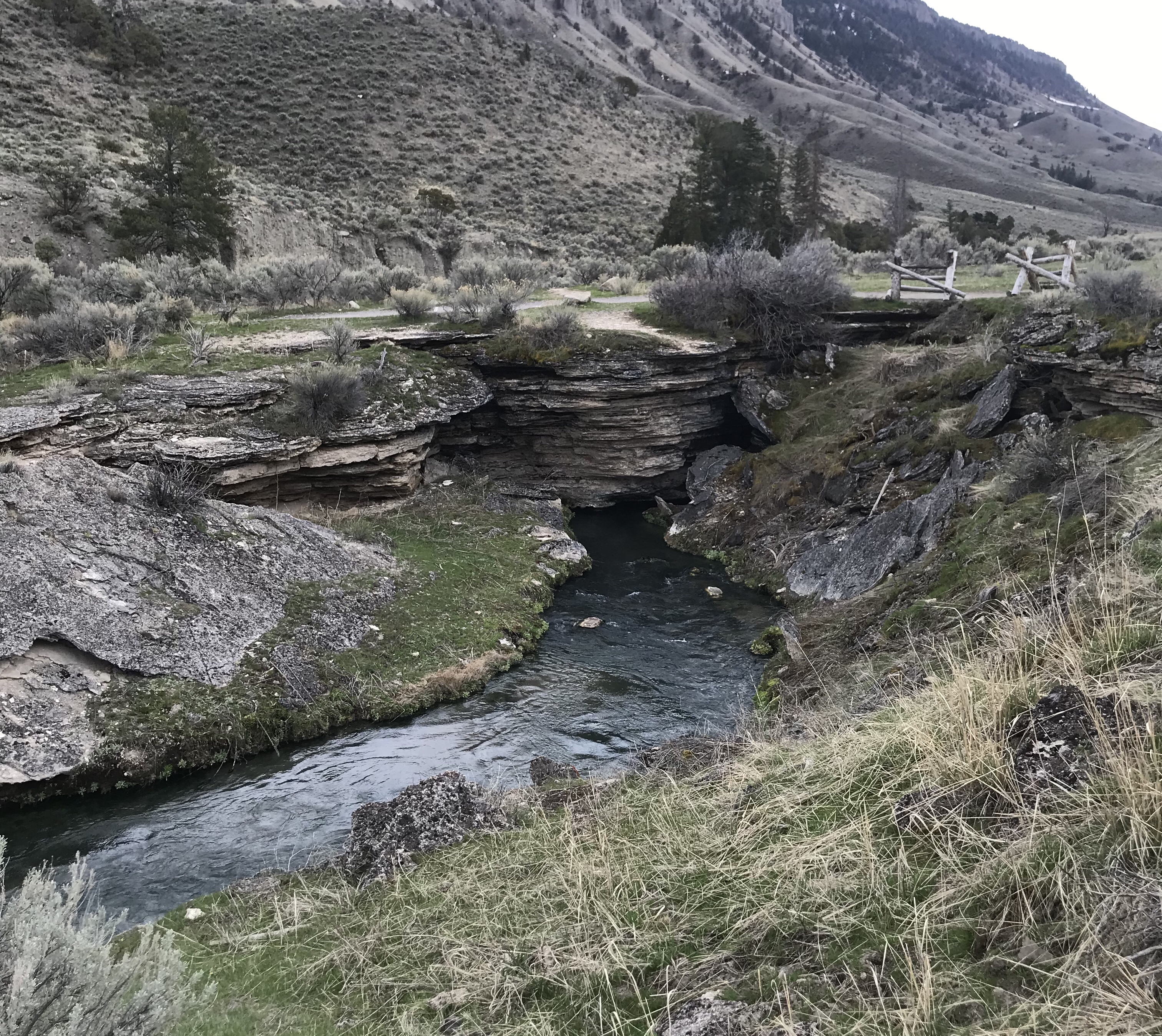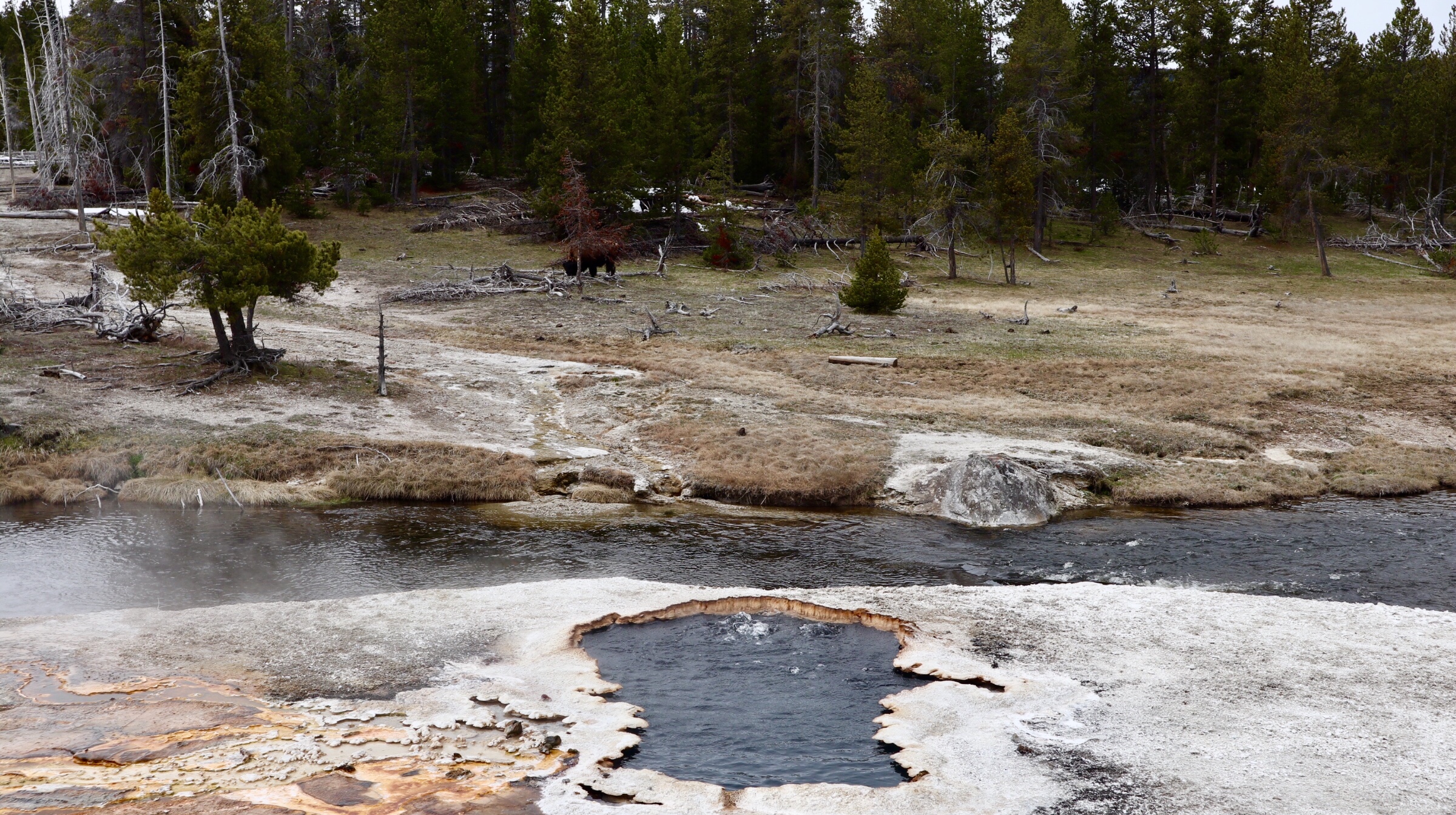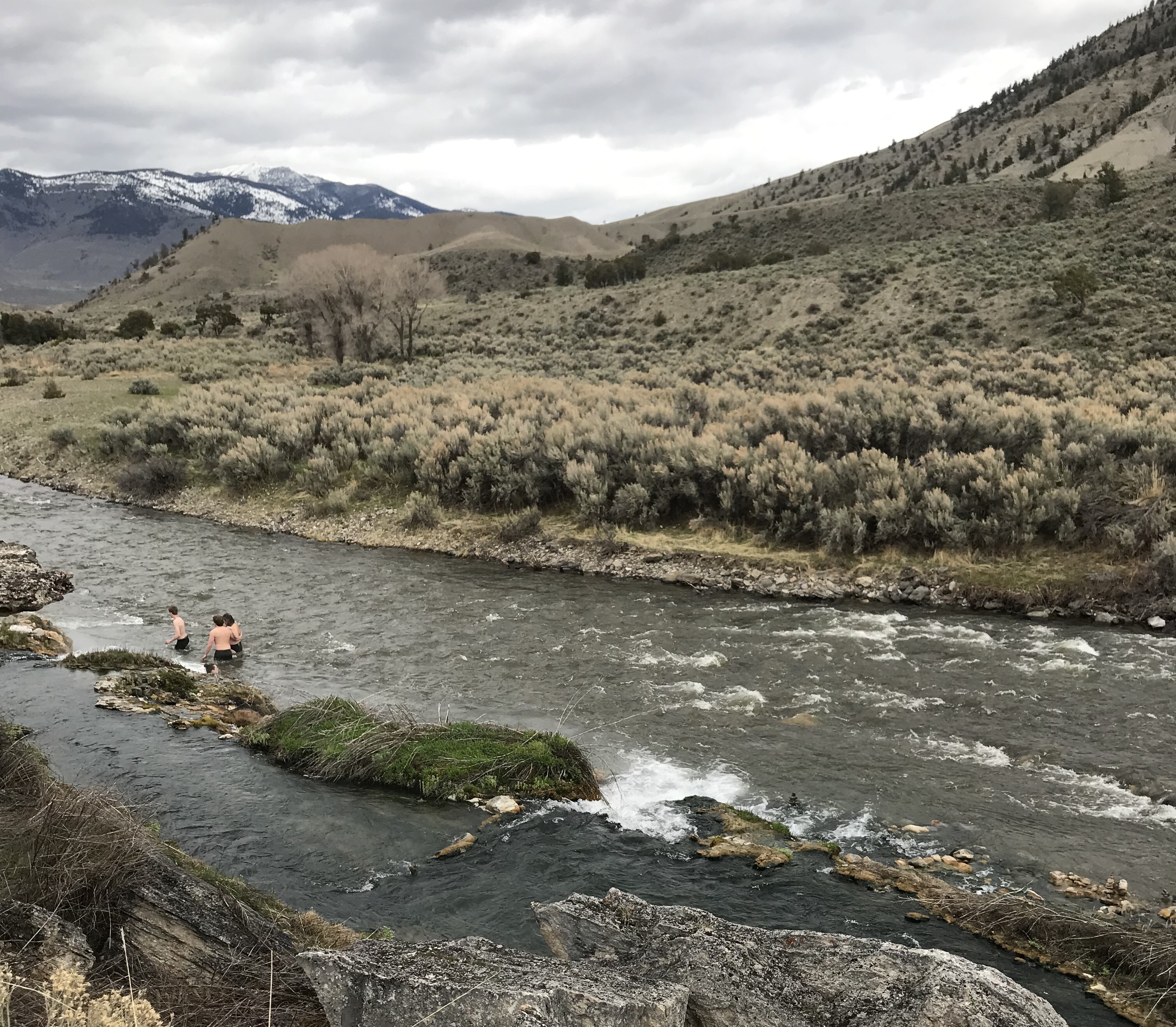 En ressortant du parc par le nord, par Mammoth Hot Springs, juste avant la sortie, nous tombons sur la Boiling River. Comme son nom l’indique, c’est une rivière BOUILLANTE. L’eau brûlante qui en sort plongé dans la Gardner River, vers la sortie du parc. À cet endroit la, et seulement celui là, il est possible de se baigner ! Attention, il faut trouver le bon emplacement, ni trop dans la Gardner, bien trop froide, ni trop proche de la Boiling River, bien trop chaude ! L’endroit idéal pour se baigner est donc assez restreint mais, lors de notre passage fin avril, l’endroit n’était pas très achalandé nous n’avons donc eu aucun mal à aller nous y prélasser !