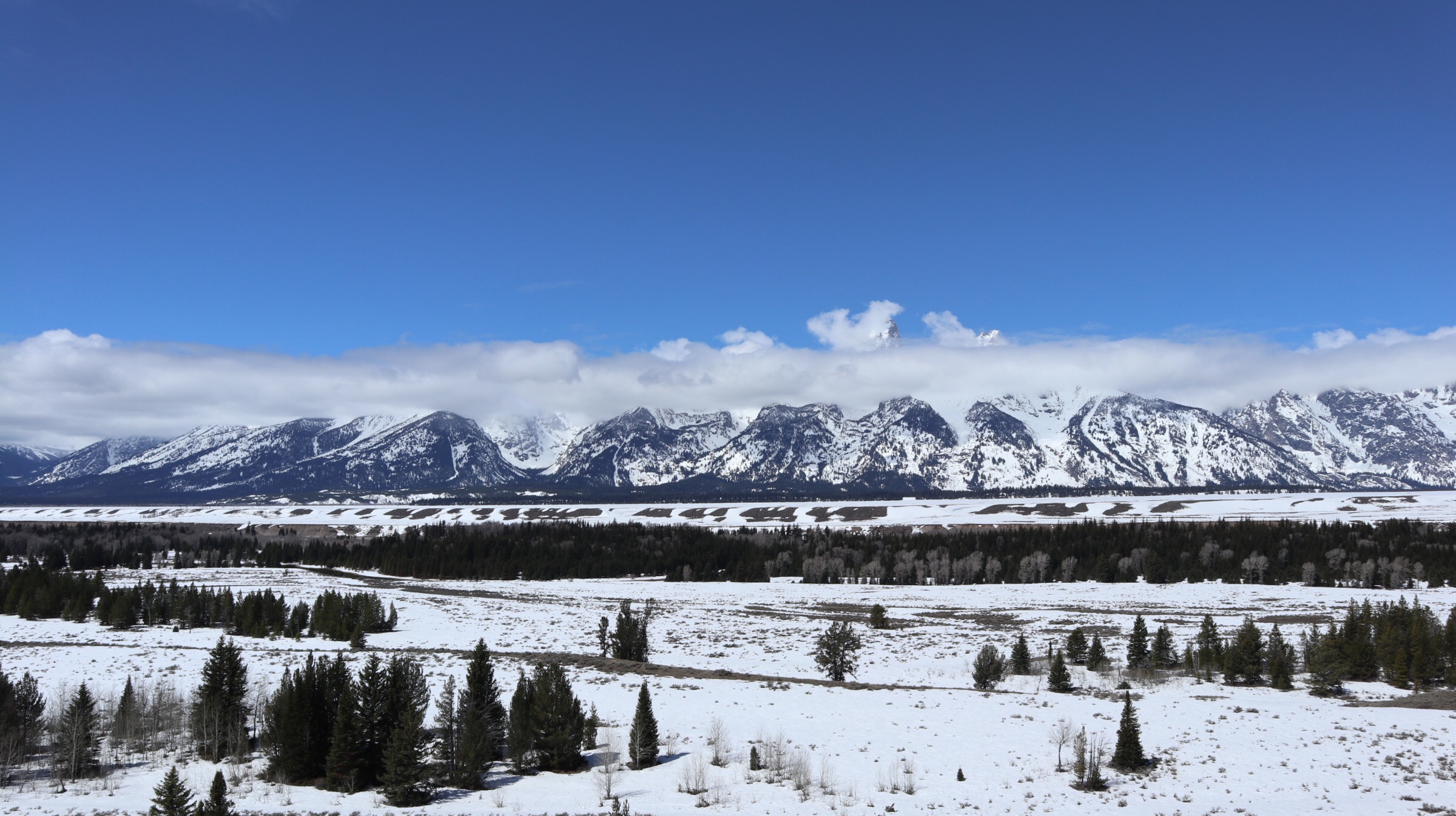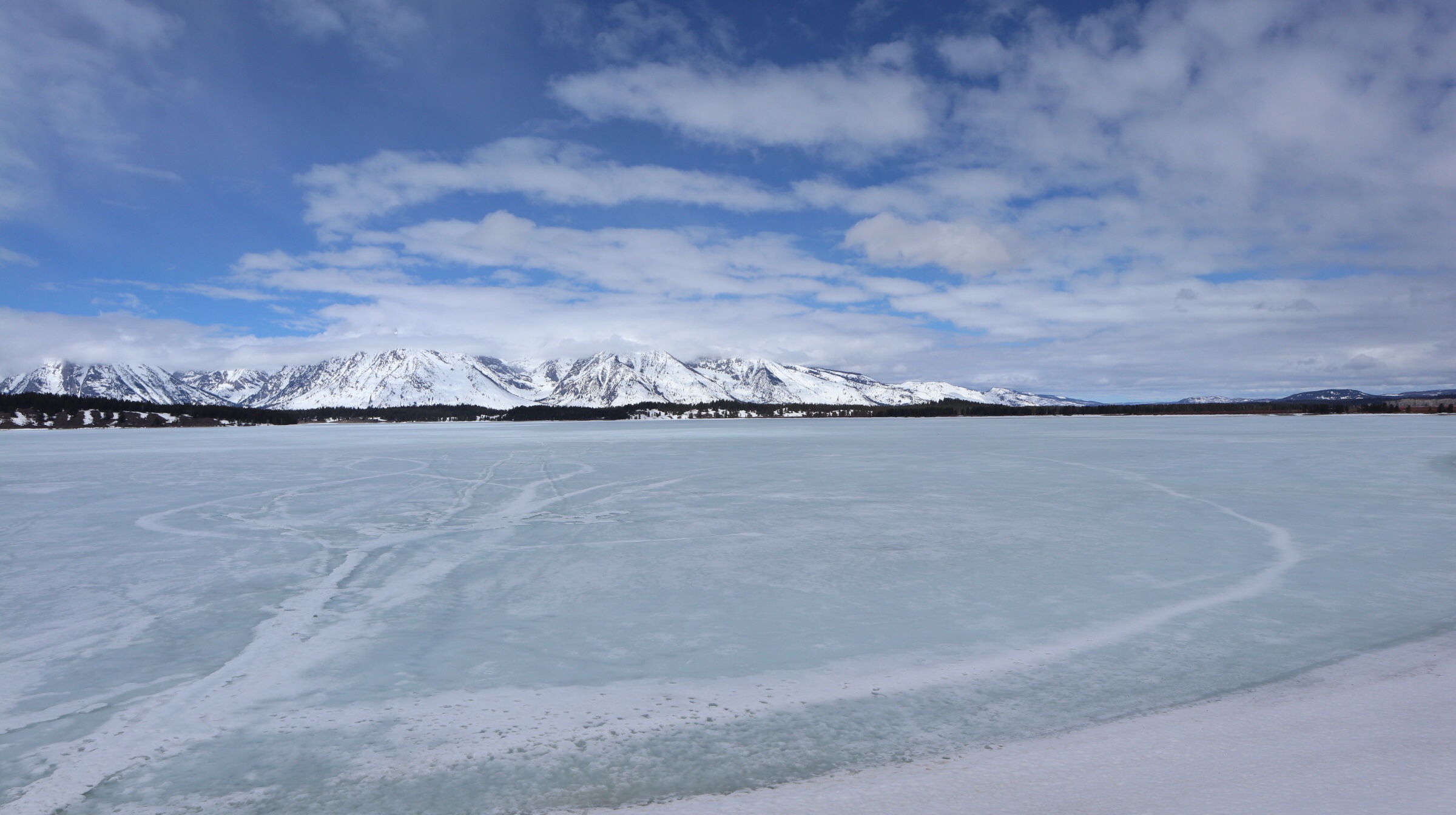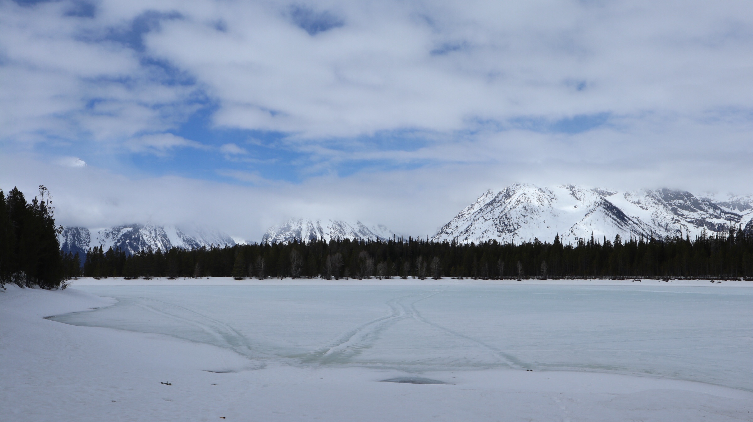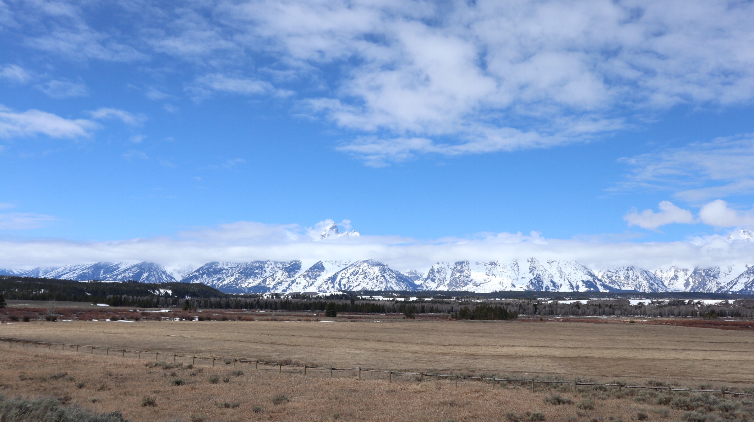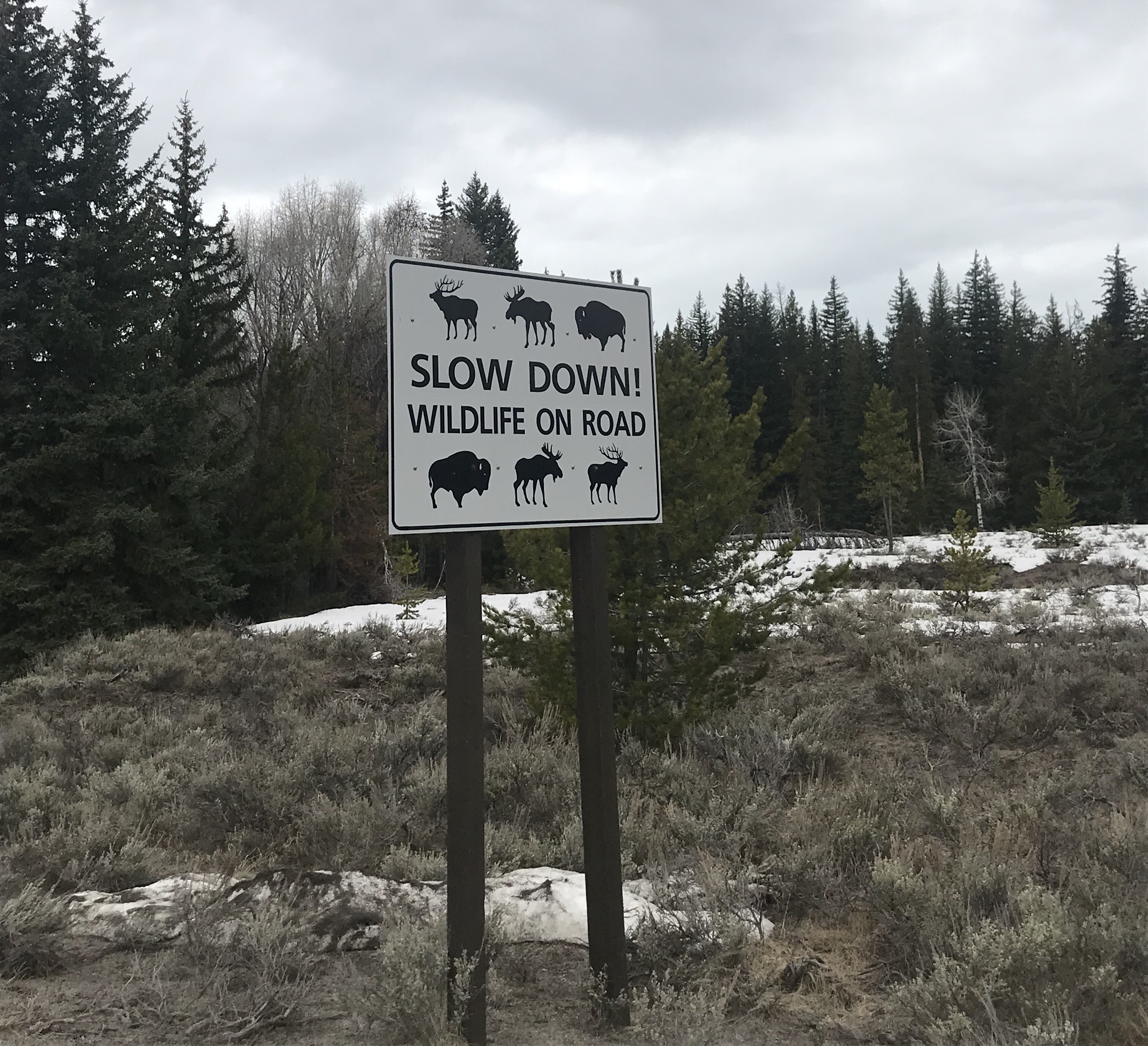 Les randonnées ? Aucun chemin tassé dans la neige, impossible de suivre quelconques traces, même avec des crampons ou des raquettes. Nous avons dû nous résoudre à faire nos vieux américains fainéants : parcourir le parc en voiture pour faire tous les points de vue. Par ailleurs, hors saison d’hiver, la route 191, qui traverse le parc, rejoint le parc de Yellowstone, situé juste au dessus. Fin avril, cette route n’était toujours pas ouverte. Au lieu de traverser grand Teton sur 84km et arriver directement par l’entrée sud à Yellowstone, il nous a fallu contourner le parc par l’ouest, soit un détour d’environ 150km. Ahhhhh les conditions hivernales dans les vastes étendues américaines…. on s’y habitue finalement.