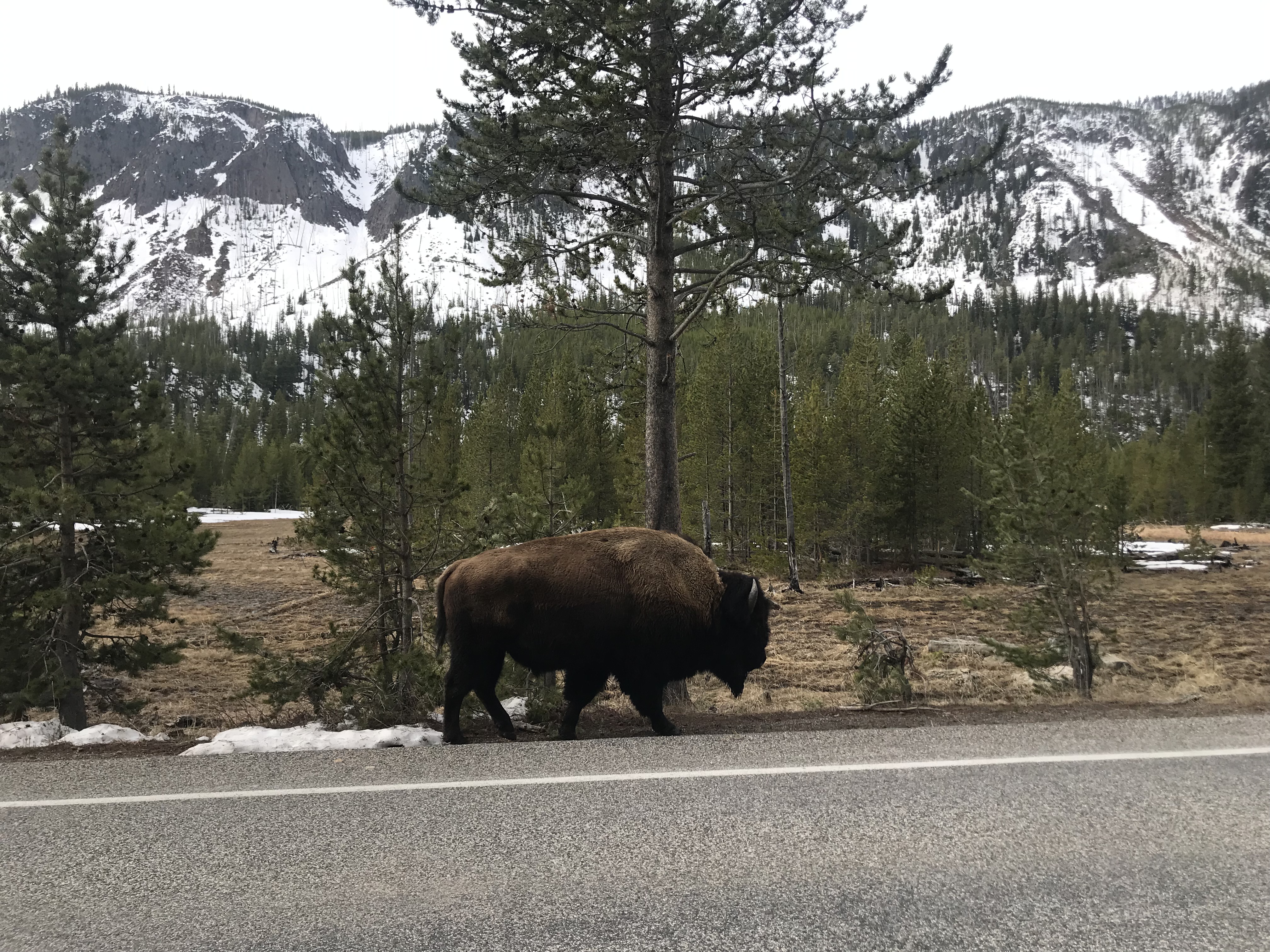 Nous nous sommes d’abord dirigés, tôt le matin, au sud vers Old Faithful. Dès notre arrivée dans le parc, nous tombons sur un groupe de bison au bord de la route, impressionnant !