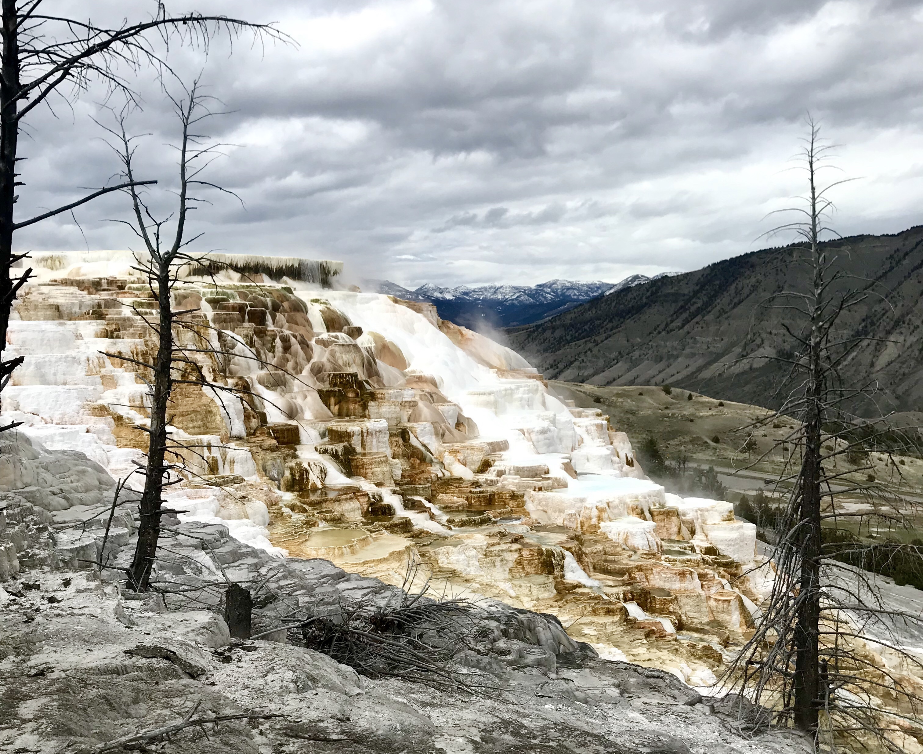 Pour occuper notre après-midi nous nous sommes ensuite rendus dans le secteur Nord, de Mammoth Hot Springs. La route change alors du tout au tout ! Beaucoup moins de plaines, nous sommes rapidement entourés de part et d’autre par les montagnes. Il y a aussi plus de neige, et le temps change rapidement. Nous trouvons l’endroit moins charmant, plus froid, plus glauque aussi. Néanmoins Mammoth Hot Springs abrite lui aussi une merveille de la nature : les travertine terraces, formées par l’interaction de l’eau et du calcaire.