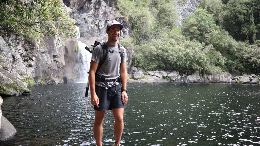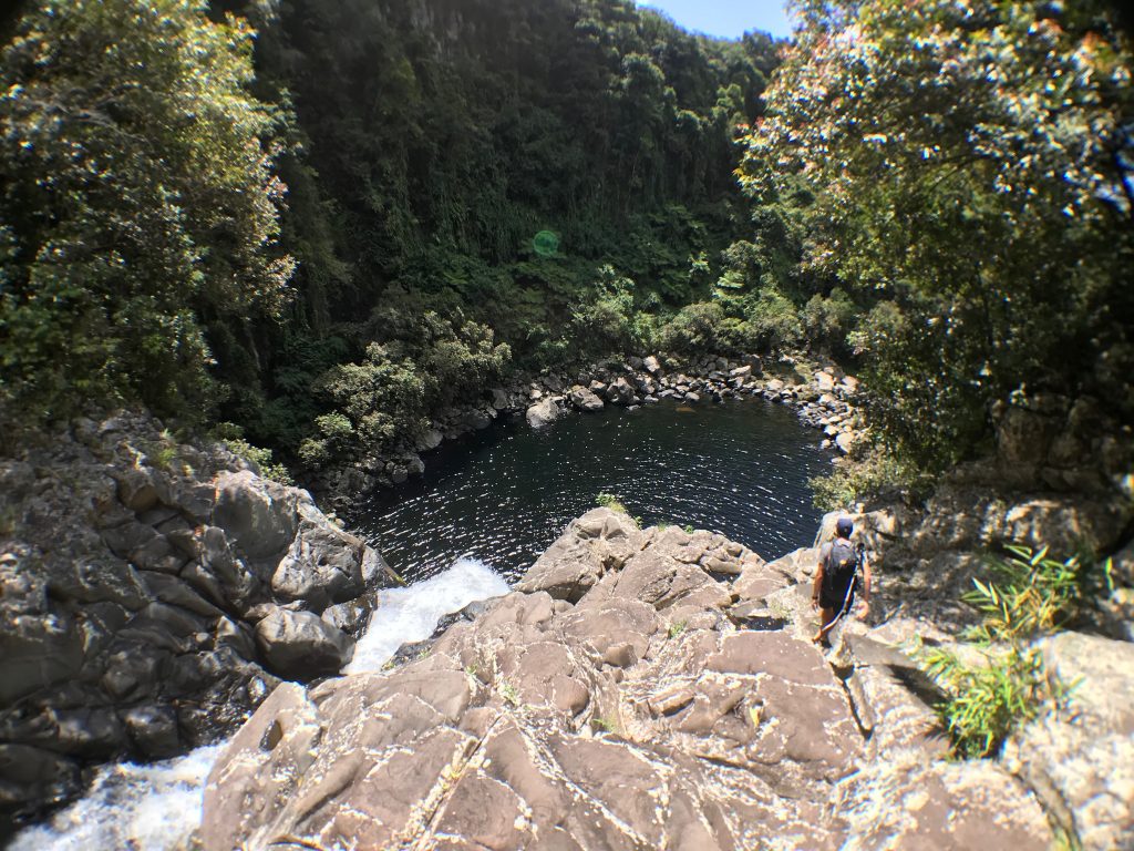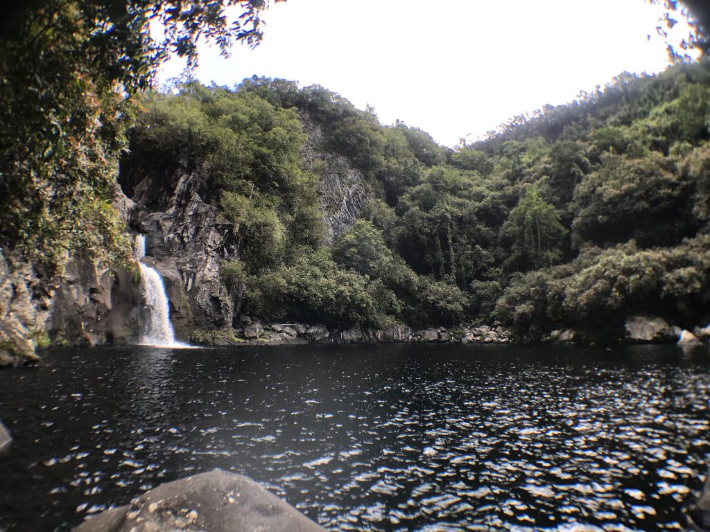 De retour sur le sentier officiel, nous rejoignons par la suite rapidement une large piste, qui, en prenant à droite, mène jusqu’au bassin et à la Cascade des Aigrettes, qui se déverse en 3 paliers. Magnifique ! Ici, nous profitons d’une pause pique-nique et poussons même jusqu’à la baignade dans l’eau pure (et fraiche) du bassin qui nous tend les bras. Un pur moment de bonheur !